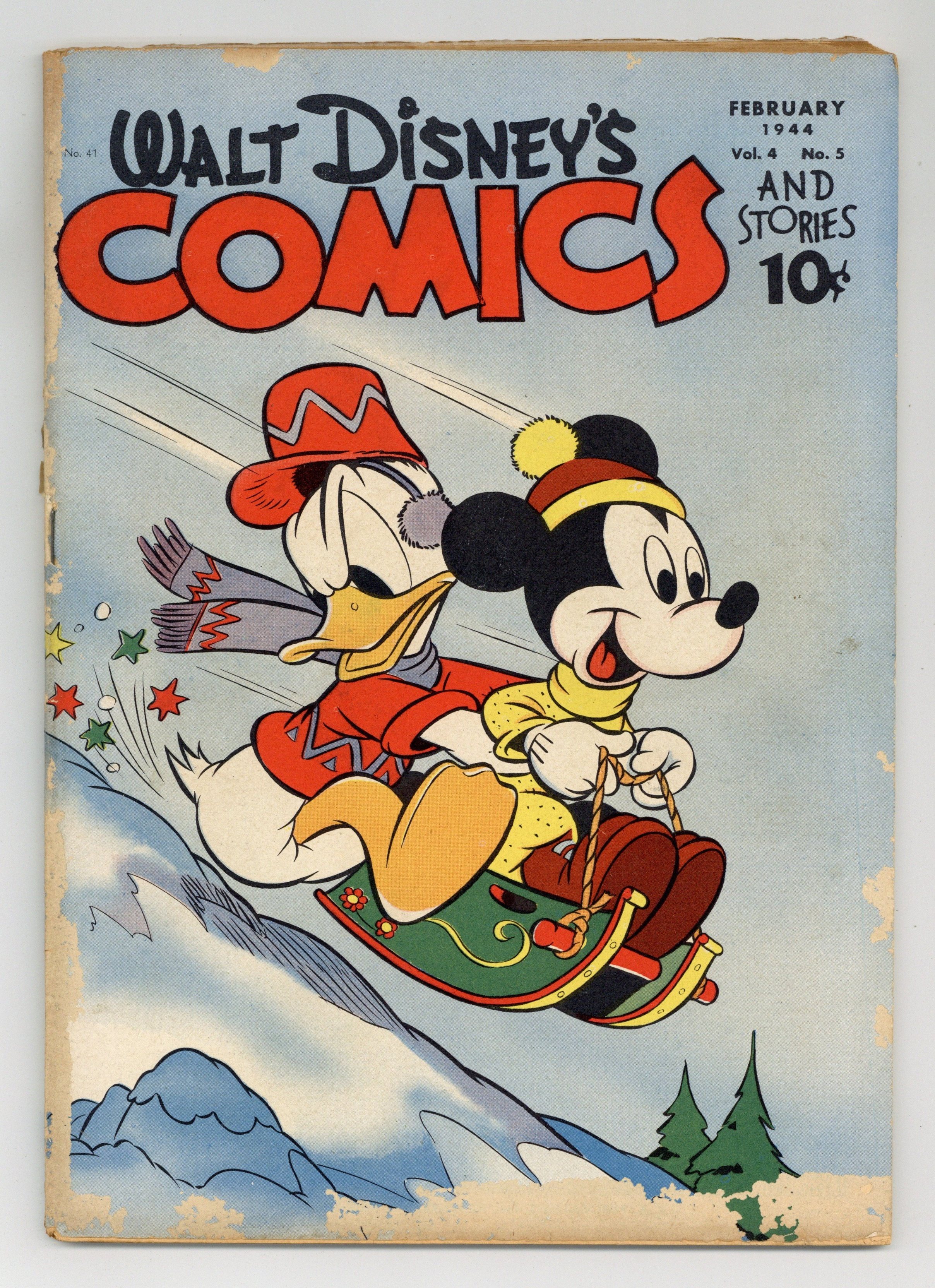 Cover by Walt Kelly. Stories and art by Walt Kelly, Carl Barks, Floyd Gottfredson, Merrill De Maris, Bob Karp, Carl Buettner, George Waiss, Manuel Gonzales, Sylvia Holland, Bill Wright, and Al Taliaferro. Sometimes listed as Vol. 4 #5. The long-running vehicle for Disney character comics featured work by Carl Barks, Floyd Gottfredson, and Pogo's Walt Kelly. In a classic Floyd Gottfredson story from the Mickey Mouse comic strip, Professor Dustibones enlists Mickey for a journey to a land of prehistoric creatures. In a story by Barks, Donald builds a suit of armor to attack his nephews' snow fort, and the combat just escalates from there. In a story by Kelly, Gremlin Gus makes mischief in the kitchen. Plus the Hollywood Chatter column discusses the fifteenth anniversary of the first Mickey Mouse cartoon. The Duck in the Iron Pants; Bucky Bug; Clearer Visibility; Tokens for Tokyo; 'Sno Use; Handwriting in the Snow; Slim Pickin's; Gremlin Gus; Mickey Mouse: In the Land of Long Ago; Hollywood Chatter; Gilt-Edged Security; Stuffy's Picnic; Table Manners; Mush, Boy, Mush!; A Difficulty Ironed Out; Aerial Combat; Sink or Swim; Let's Make Valentines; Hey, Rube!; Winter Sports; The Invisible Man; It's a Gift; Getting Down to Earth; Horse Sense; All Snow and a Yard Wide; School's Out; Patriot Satisfies Wanderlust; Insomnia 'Nipped' in the Bud; Pass The Ammunition; Fair and Warmer. 56 pages, Full Color. Cover price $0.10.