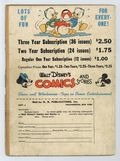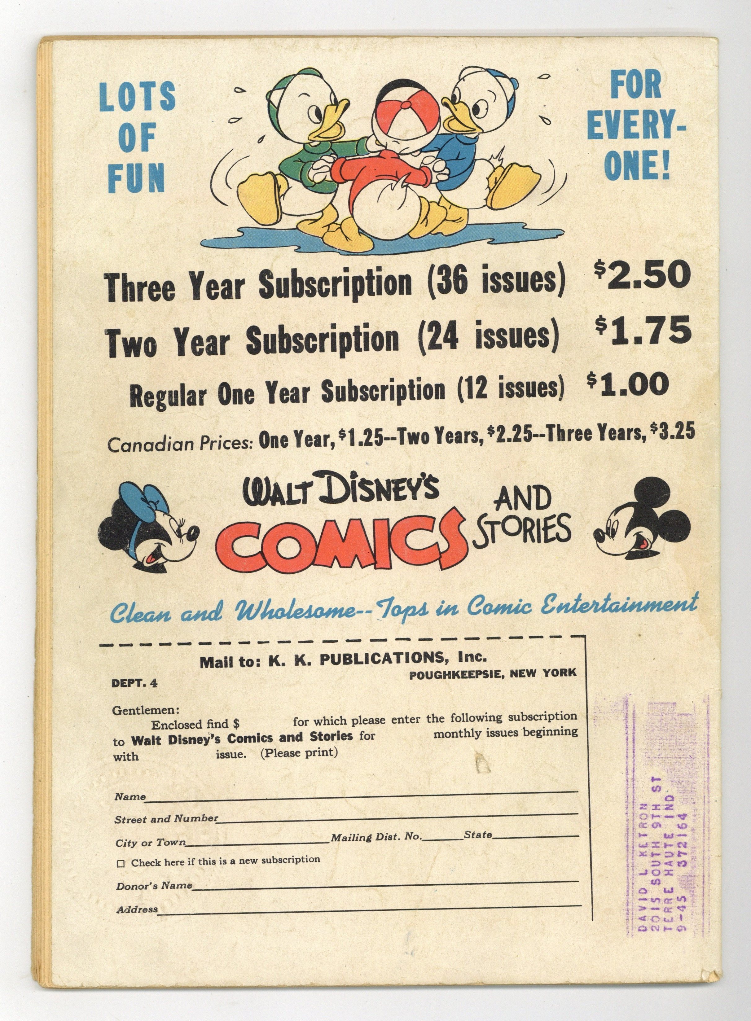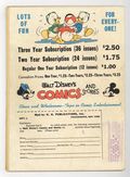 Cover by Walt Kelly. Stories and art by Carl Barks, Floyd Gottfredson, Merrill De Maris, Dick Moores, Bill Walsh, Bob Karp, Hubie Karp, Carl Buettner, George Waiss, Manuel Gonzales, Bill Wright, and Al Taliaferro. Sometimes listed as Vol. 5 #7. The long-running vehicle for Disney character comics featured work by Carl Barks, Floyd Gottfredson, and Pogo's Walt Kelly. In a classic Floyd Gottfredson story from the Mickey Mouse comic strip, Mickey uses mysterious machinery to build a box with strange powers over time and space. In a story by Barks, Donald takes his nephews to Cousin Coot's ranch to prove that he's a real cowboy. Bucky Bug uncovers a plot to rob the bug bank. Donald Duck; Bucky Bug; Mickey Mouse; The Seven Dwarfs and Dumbo; The Eyes Have It; Goofy; Thumper Plays Easter Rabbit; Mickey Mouse and the 'Lectro Box. 48 pages, Full Color. Cover price $0.10.