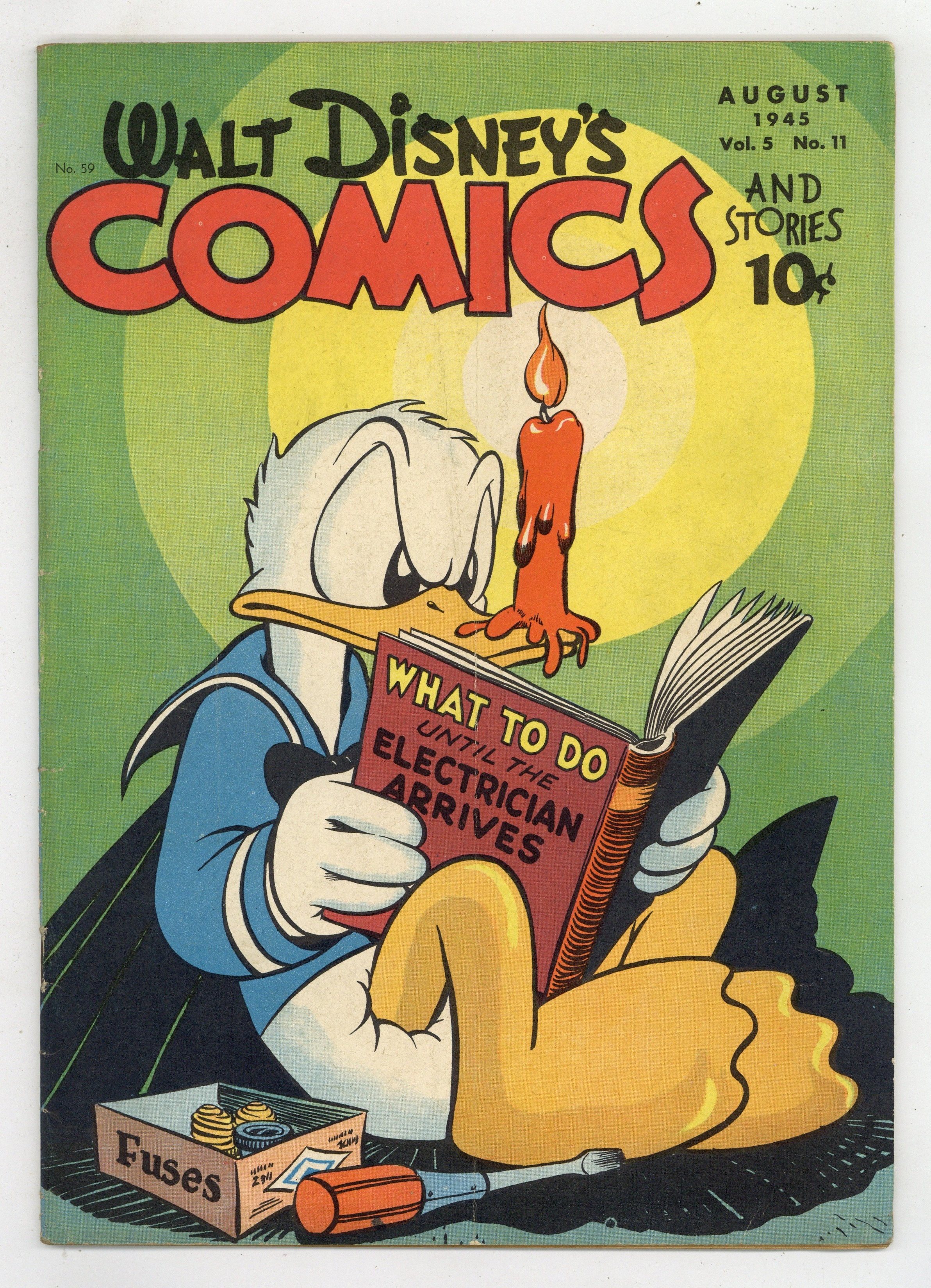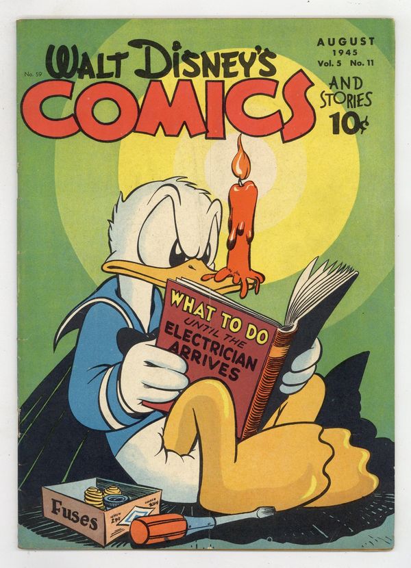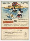 Cover by Walt Kelly. Stories and art by Carl Barks, Floyd Gottfredson, Merrill De Maris, Dick Moores, Bob Karp, Hubie Karp, Carl Buettner, George Waiss, Manuel Gonzales, Bill Wright, and Al Taliaferro. Sometimes listed as Vol. 5 #11. The long-running vehicle for Disney character comics featured work by Carl Barks, Floyd Gottfredson, and Pogo's Walt Kelly. In a classic Floyd Gottfredson story from the Mickey Mouse comic strip, a giant crow is starting fires at the farm where Mickey and Goofy are working. In a story by Barks, Donald tries to tries to tame a wild colt while vacationing at a dude ranch. Bo opens a restaurant and faces competition from a crooked rival. Donald Duck; Bucky Bug; Mickey Mouse; Li'l Bad Wolf; Goofy; Horse Sense; Sherman Was Right; It's In the Bag; Sabotage on the Home Front; Mickey Mouse: The Black Crow Mystery. 48 pages, Full Color. Cover price $0.10.