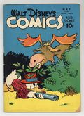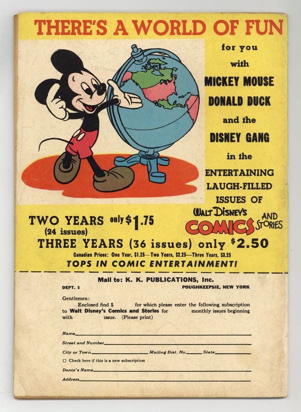 Cover by Walt Kelly. Stories and art by Carl Barks, Floyd Gottfredson, Bill Walsh, Bob Karp, Hubie Karp, Carl Buettner, George Waiss, Manuel Gonzales, Don Gunn, Bill Wright, Sylvia Holland, and Al Taliaferro. Sometimes listed as Vol. 6 #8. The long-running vehicle for Disney character comics featured work by Carl Barks, Floyd Gottfredson, and Pogo's Walt Kelly. In a classic story from the Mickey Mouse comic strip, Mickey tries to thwart the plans of a mad scientist. In a story by Barks, Donald tries to prove his kite-flying skills by building the biggest kite of all. Bucky Bug enters a mail-carrying race. Donald Duck; Bucky Bug; Li'l Bad Wolf; Mickey Mouse; Pluto's Housewarming; The Spring Picnic; Mickey Mouse: The Professor's Experiment. 48 pages, Full Color. Cover price $0.10.