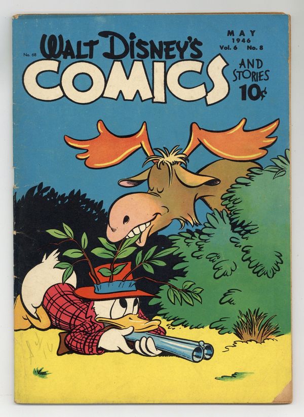 Tags: Disney Ducks & MicePublished May 1946 by Dell/Gold Key.$29.00Cover by Walt Kelly. Stories and art by Carl Barks, Floyd Gottfredson, Bill Walsh, Bob Karp, Hubie Karp, Carl Buettner, George Waiss, Manuel Gonzales, Don Gunn, Bill Wright, Sylvia Holland, and Al Taliaferro. Sometimes listed as Vol. 6 #8. The long-running vehicle for Disney character comics featured work by Carl Barks, Floyd Gottfredson, and Pogo's Walt Kelly. In a classic story from the Mickey Mouse comic strip, Mickey tries to thwart the plans of a mad scientist. In a story by Barks, Donald tries to prove his kite-flying skills by building the biggest kite of all. Bucky Bug enters a mail-carrying race. Donald Duck; Bucky Bug; Li'l Bad Wolf; Mickey Mouse; Pluto's Housewarming; The Spring Picnic; Mickey Mouse: The Professor's Experiment. 48 pages, Full Color. Cover price $0.10.