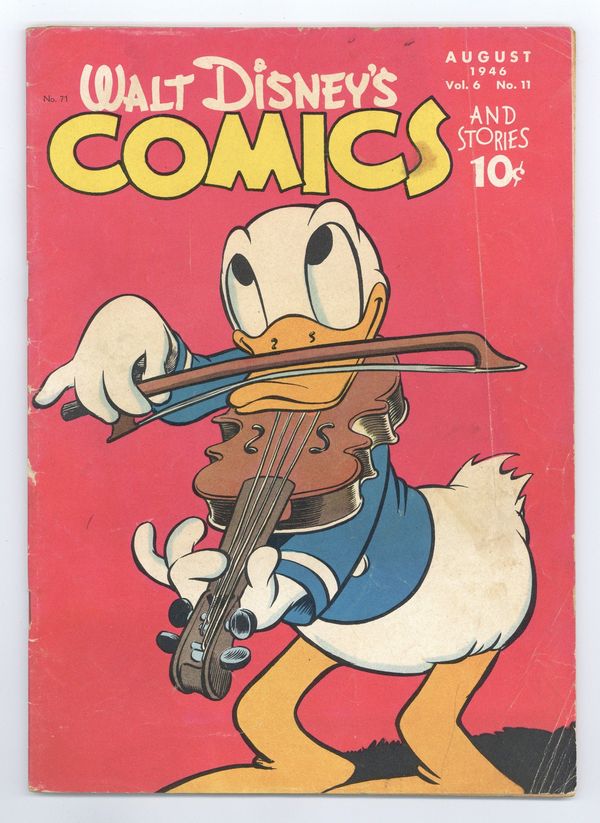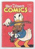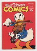 Tags: Disney Ducks & MicePublished Aug 1946 by Dell/Gold Key.$44.00Cover by Walt Kelly. Stories and art by Carl Barks, Floyd Gottfredson, Bill Walsh, Bob Karp, Karl Karpé, Carl Buettner, George Waiss, Bill Wright, Sylvia Holland, and Al Taliaferro. Sometimes listed as Vol. 6 #11. The long-running vehicle for Disney character comics featured work by Carl Barks, Floyd Gottfredson, and Pogo's Walt Kelly. In a classic story from the Mickey Mouse comic strip, Mickey goes to the future, where he battles robots controlled by Peg Leg Pete. In a story by Barks, Donald tries to keep his nephews from falling in with the wrong crowd. Plus a comics adaptation of the Peter and the Wolf segment from the Disney film "Make Mine Music." Donald Duck; Bucky Bug; Peter and the Wolf; Mickey Mouse; Dangerous Curves; Wet Paint; The Black Pony; Second Childhood; Meeting Adjourned!; Mickey Mouse: The World of Tomorrow. 48 pages, Full Color. Cover price $0.10.