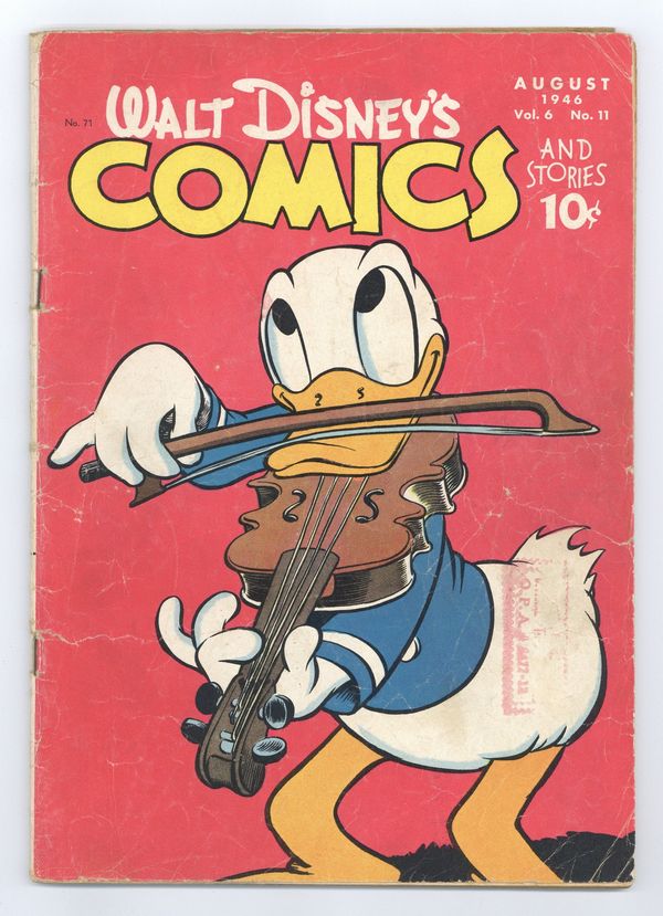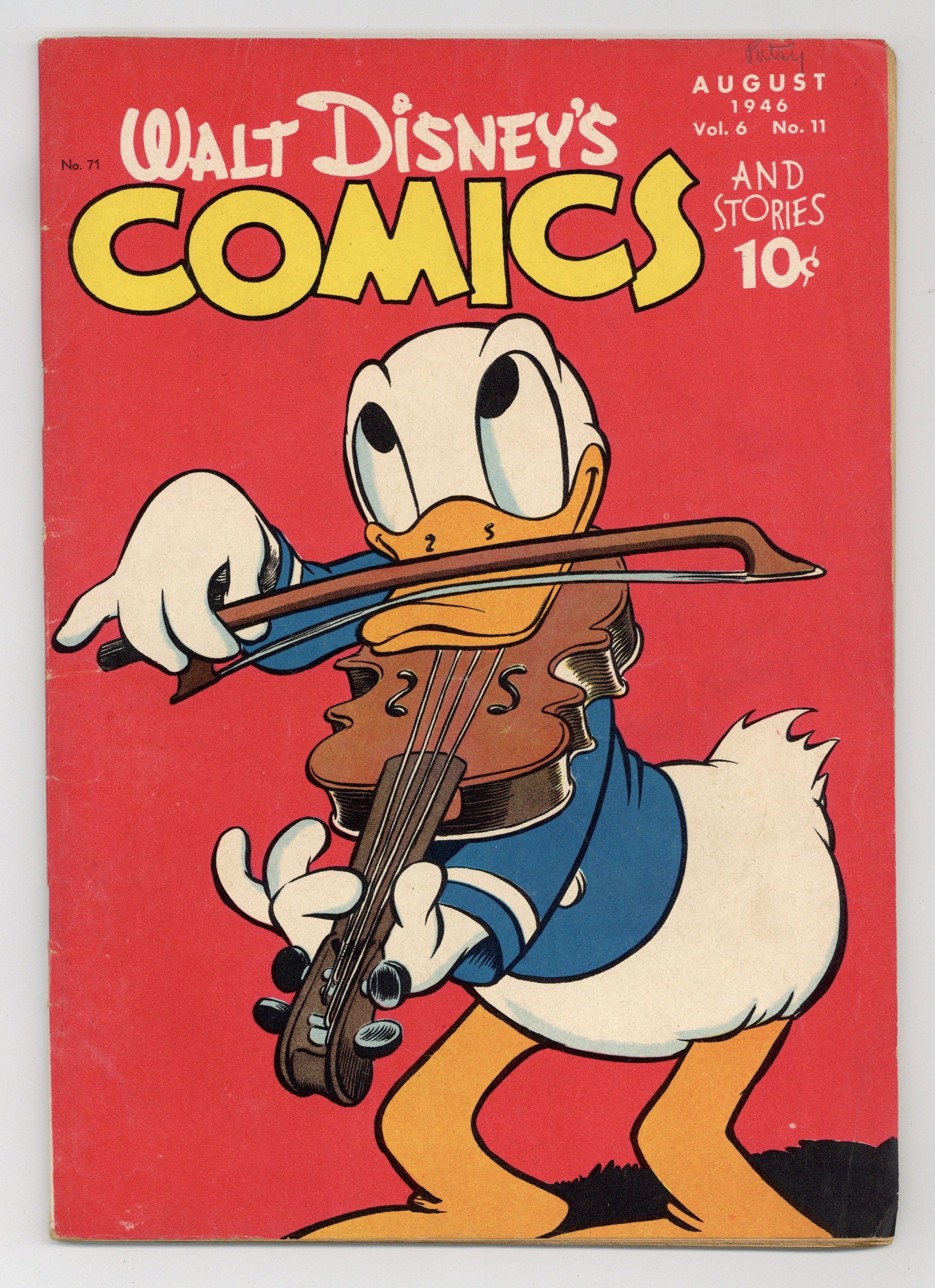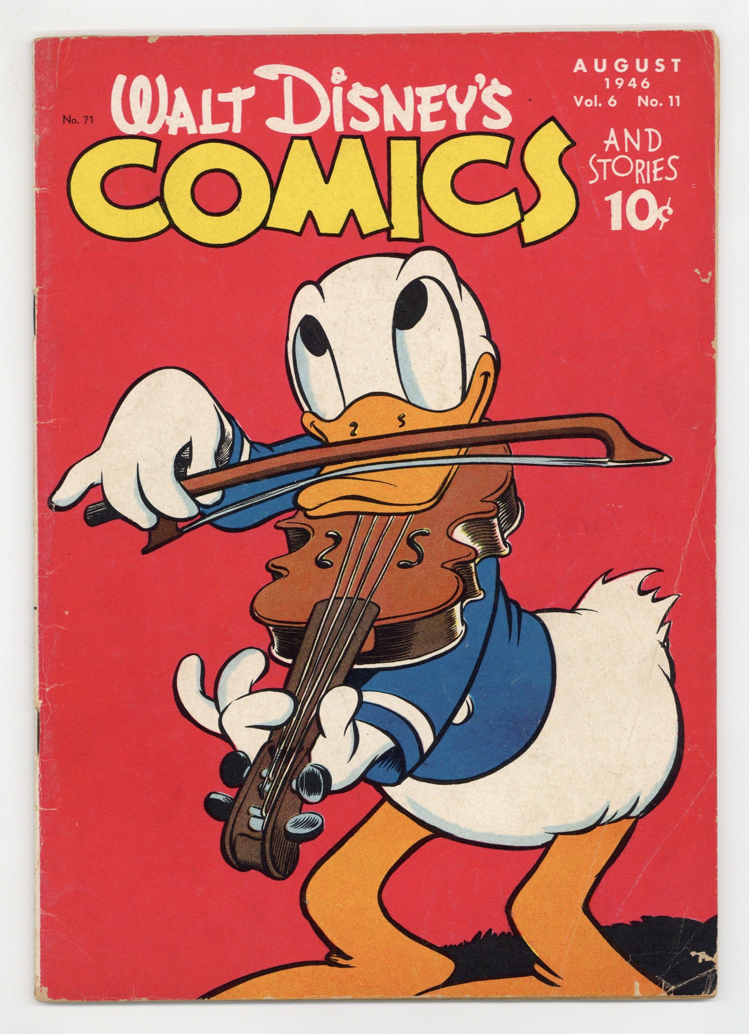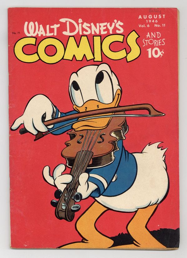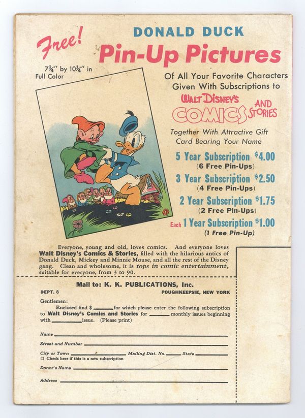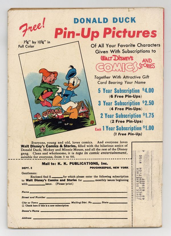Cover by Walt Kelly. Stories and art by Carl Barks, Floyd Gottfredson, Bill Walsh, Bob Karp, Karl Karpé, Carl Buettner, George Waiss, Bill Wright, Sylvia Holland, and Al Taliaferro. Sometimes listed as Vol. 6 #11. The long-running vehicle for Disney character comics featured work by Carl Barks, Floyd Gottfredson, and Pogo's Walt Kelly. In a classic story from the Mickey Mouse comic strip, Mickey goes to the future, where he battles robots controlled by Peg Leg Pete. In a story by Barks, Donald tries to keep his nephews from falling in with the wrong crowd. Plus a comics adaptation of the Peter and the Wolf segment from the Disney film "Make Mine Music." Donald Duck; Bucky Bug; Peter and the Wolf; Mickey Mouse; Dangerous Curves; Wet Paint; The Black Pony; Second Childhood; Meeting Adjourned!; Mickey Mouse: The World of Tomorrow. 48 pages, Full Color. Cover price $0.10.