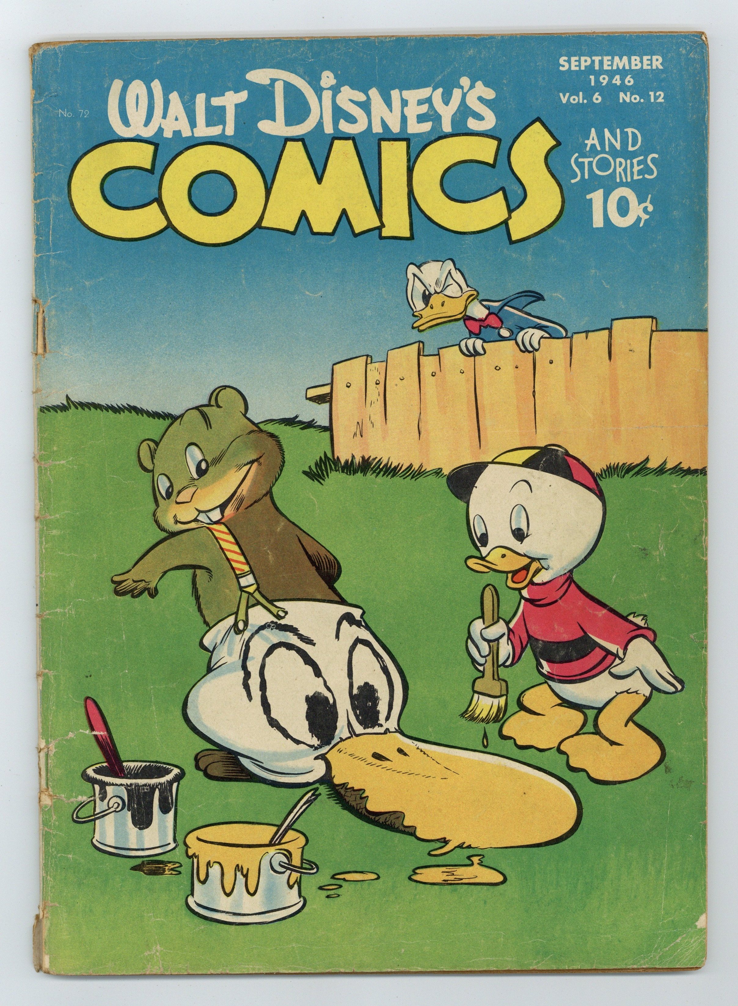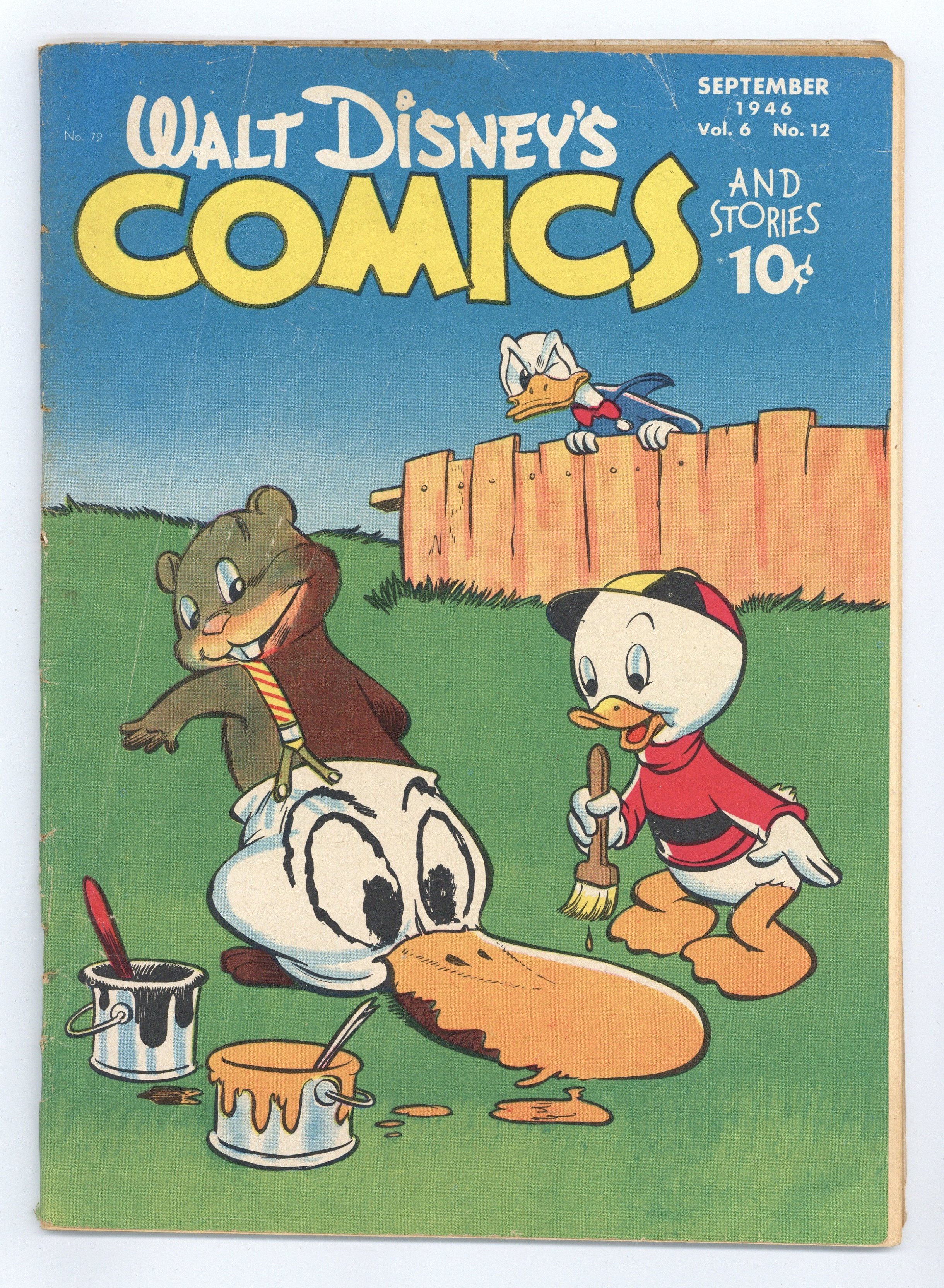 Tags: Disney Ducks & MicePublished Sep 1946 by Dell/Gold Key.$25.00- 1" cumulative spine split. Cover detached. Water damage. Staple rust.