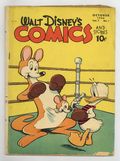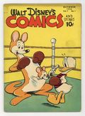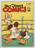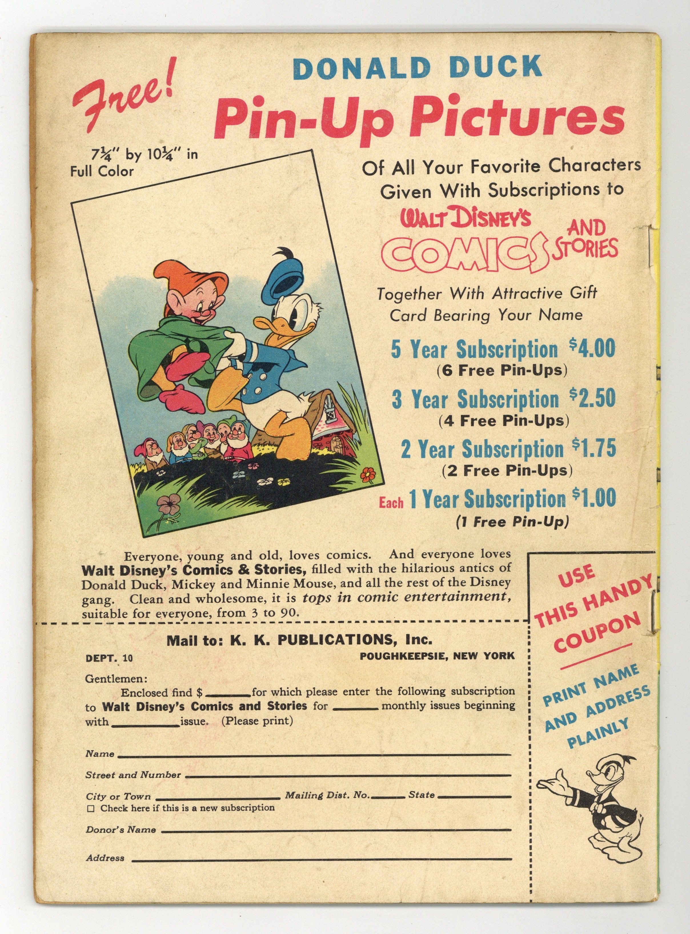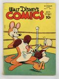 Cover by Walt Kelly. Stories and art by Carl Barks, Floyd Gottfredson, Bill Walsh, Bob Karp, Karl Karpé, Hubie Karp, George Waiss, Bill Wright, Sylvia Holland, and Al Taliaferro. Sometimes listed as Vol. 7 #1. The long-running vehicle for Disney character comics featured work by Carl Barks, Floyd Gottfredson, and Pogo's Walt Kelly. In a classic story from the Mickey Mouse comic strip, Mickey investigates the haunted house he inherited from his Uncle Max. In a story by Barks, Donald's nephews invent a gold finder. Li'l Bad Wolf learns that in the Woods, not all Grandmas are what they appear to be. Donald Duck; Bucky Bug; Li'l Bad Wolf; Mickey Mouse; Johnny Fedora; Goofy the Magician; No Soap!; The Big Wind; Minnie Mouse: Bath Day; Lighthouse Keeping; Mickey Mouse: The House of Mystery. 48 pages, Full Color. Cover price $0.10.