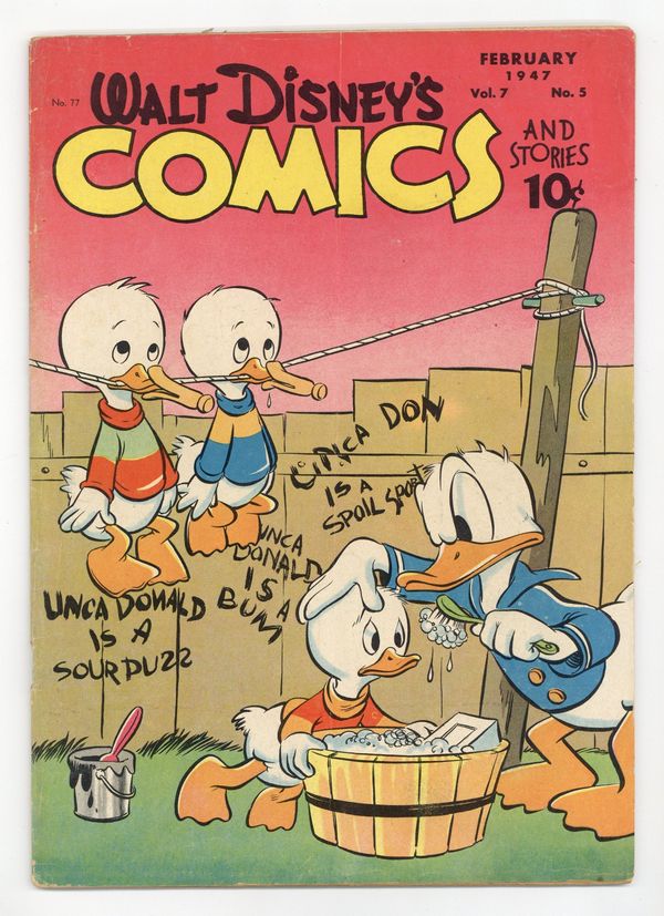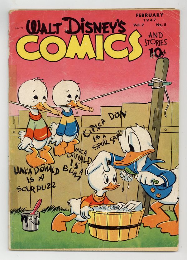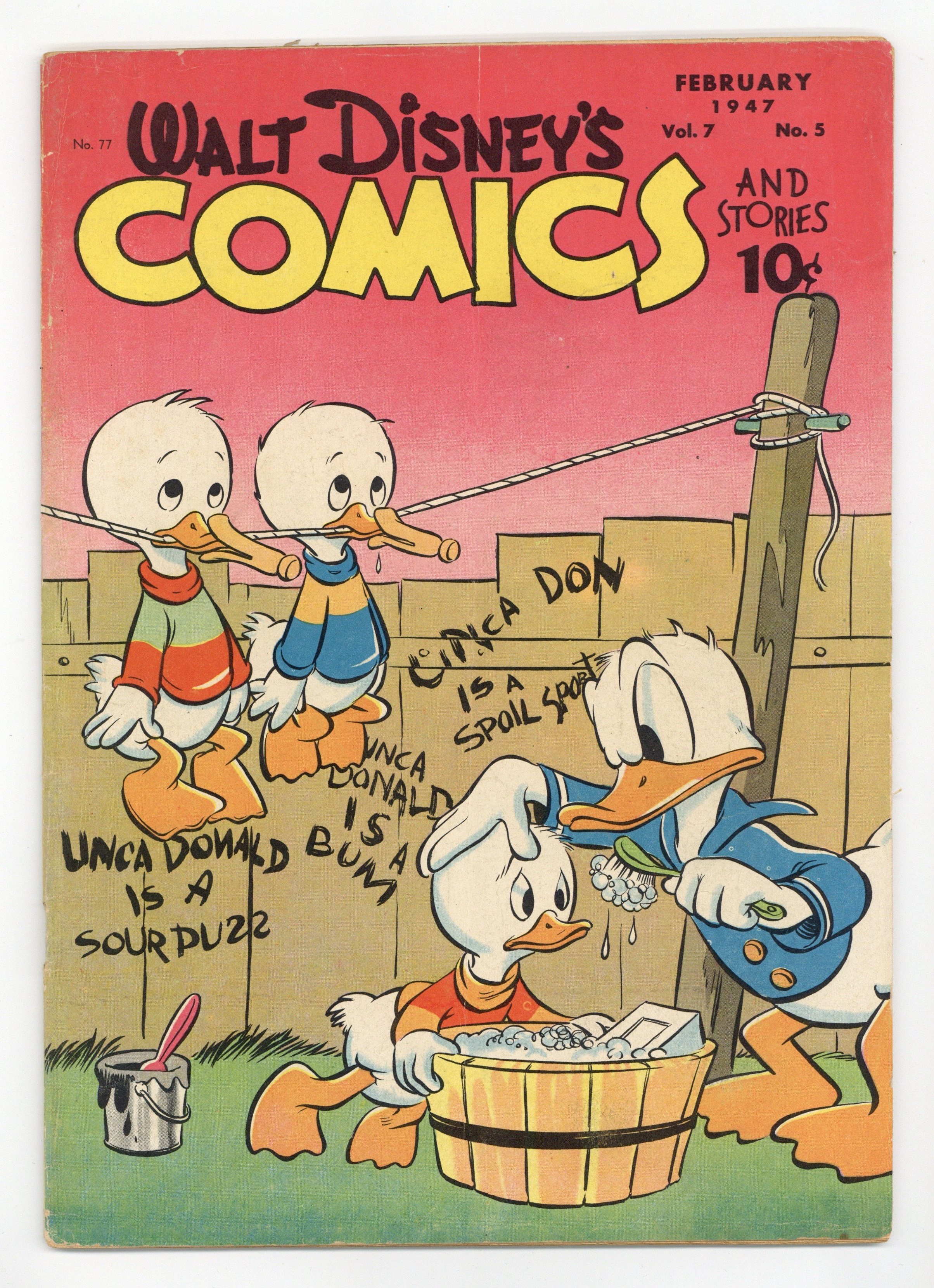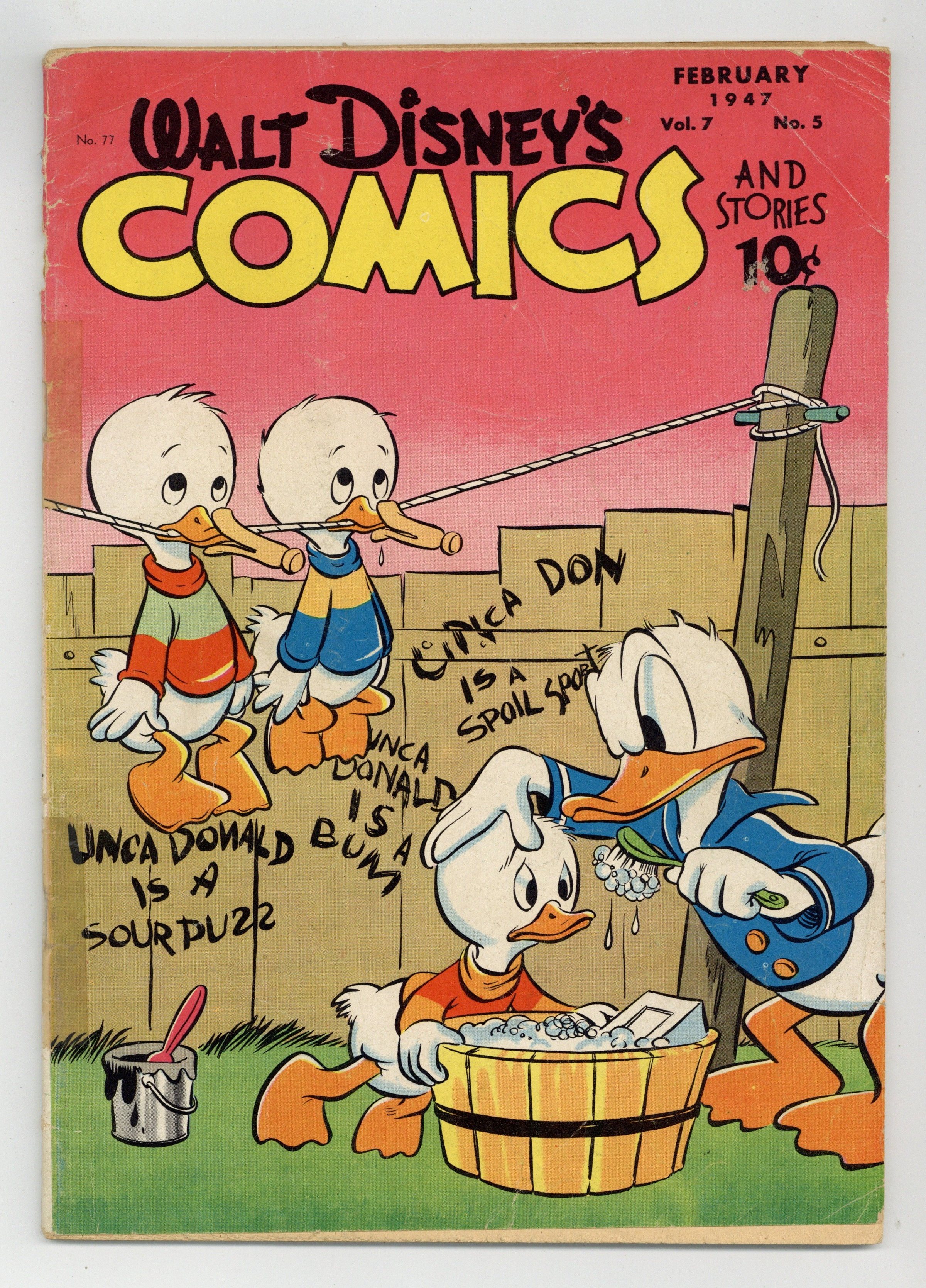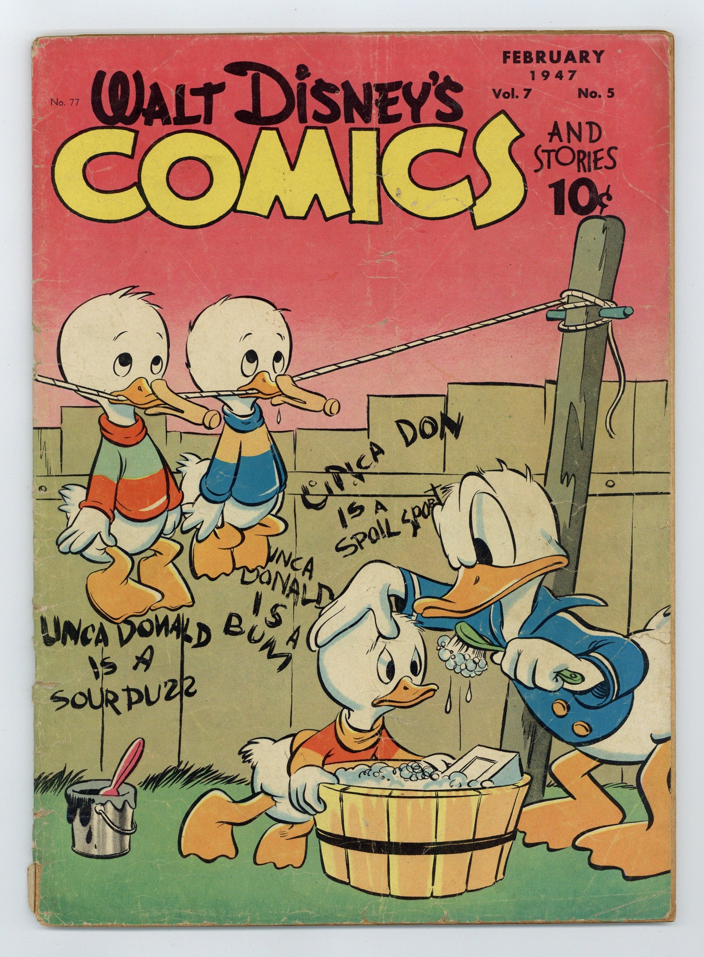 Tags: Disney Ducks & MicePublished Feb 1947 by Dell/Gold Key.$30.00- 1" spine split from bottom. Cover oxidation. Water spotting. Staple rust.