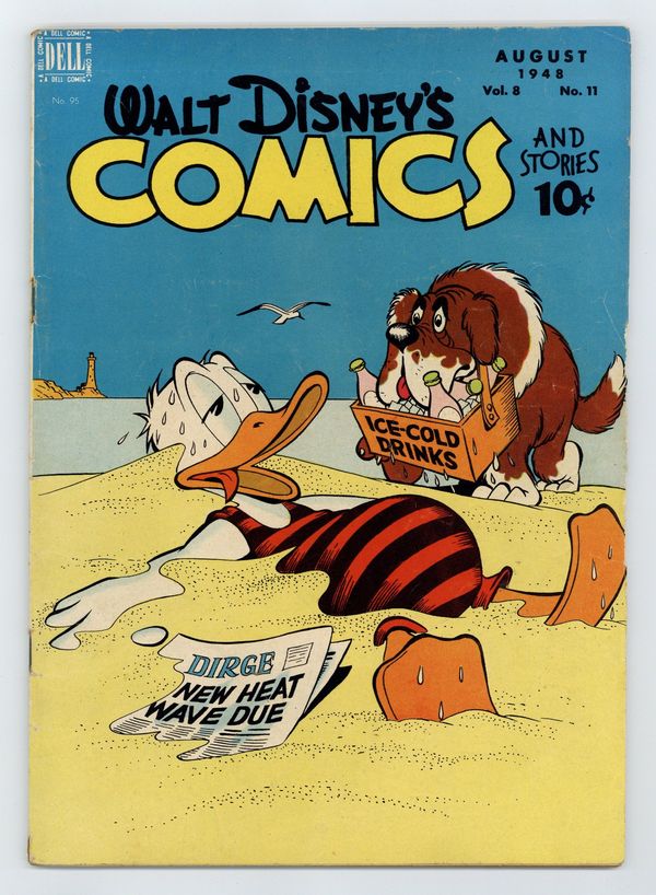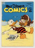 Tags: Disney Ducks & MicePublished Aug 1948 by Dell/Gold Key.$30.00Cover by Carl Barks. Stories and art by Carl Barks, Floyd Gottfredson, Bill Walsh, Dick Moores, Bob Karp, Hubie Karp, Ralph Heimdahl, Harvey Eisenberg, Gil Turner, George Waiss, Bill Wright, and Al Taliaferro. Sometimes listed as Vol. 8 #11. The long-running vehicle for Disney character comics featured work by Carl Barks, Floyd Gottfredson, and Pogo's Walt Kelly. In a classic story from the Mickey Mouse comic strip, Mickey hosts Minnie's demanding aunt Marissa, who unexpectedly takes a liking to Goofy. In a story by Barks, Donald and Gladstone talk themselves into a fund-raising race for Daisy's club. Bootle Beetle reveals his life story to Bucky Bug. Donald Duck; Bucky Bug; Li'l Bad Wolf; Mickey Mouse; The Trial of Donald Duck; Three for Breakfast; Mickeys "Safe and Sane" Fourth; Mickey Mouse and Aunt Marissa. 48 pages, Full Color. Cover price $0.10.