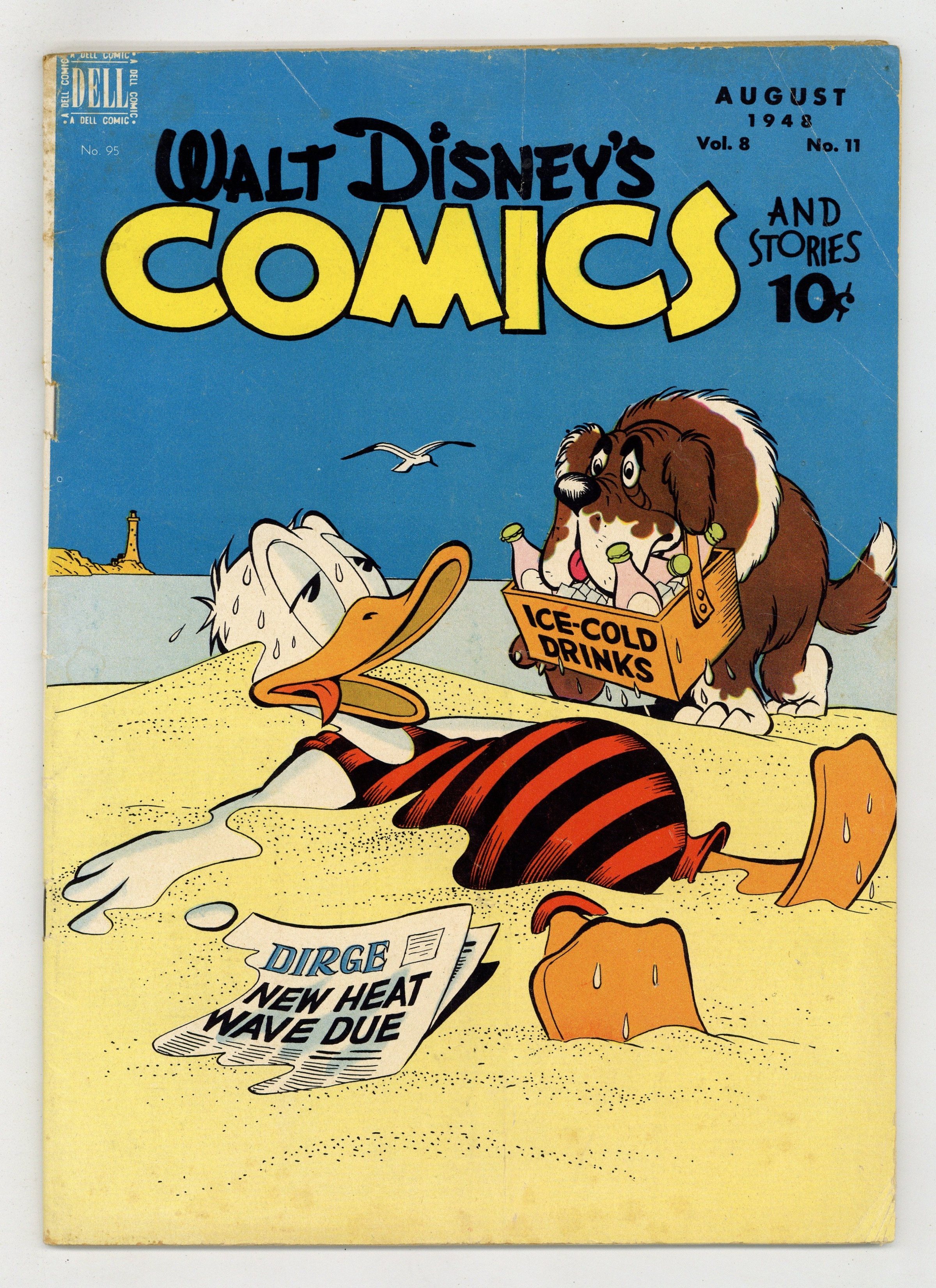 Cover by Carl Barks. Stories and art by Carl Barks, Floyd Gottfredson, Bill Walsh, Dick Moores, Bob Karp, Hubie Karp, Ralph Heimdahl, Harvey Eisenberg, Gil Turner, George Waiss, Bill Wright, and Al Taliaferro. Sometimes listed as Vol. 8 #11. The long-running vehicle for Disney character comics featured work by Carl Barks, Floyd Gottfredson, and Pogo's Walt Kelly. In a classic story from the Mickey Mouse comic strip, Mickey hosts Minnie's demanding aunt Marissa, who unexpectedly takes a liking to Goofy. In a story by Barks, Donald and Gladstone talk themselves into a fund-raising race for Daisy's club. Bootle Beetle reveals his life story to Bucky Bug. Donald Duck; Bucky Bug; Li'l Bad Wolf; Mickey Mouse; The Trial of Donald Duck; Three for Breakfast; Mickeys "Safe and Sane" Fourth; Mickey Mouse and Aunt Marissa. 48 pages, Full Color. Cover price $0.10.