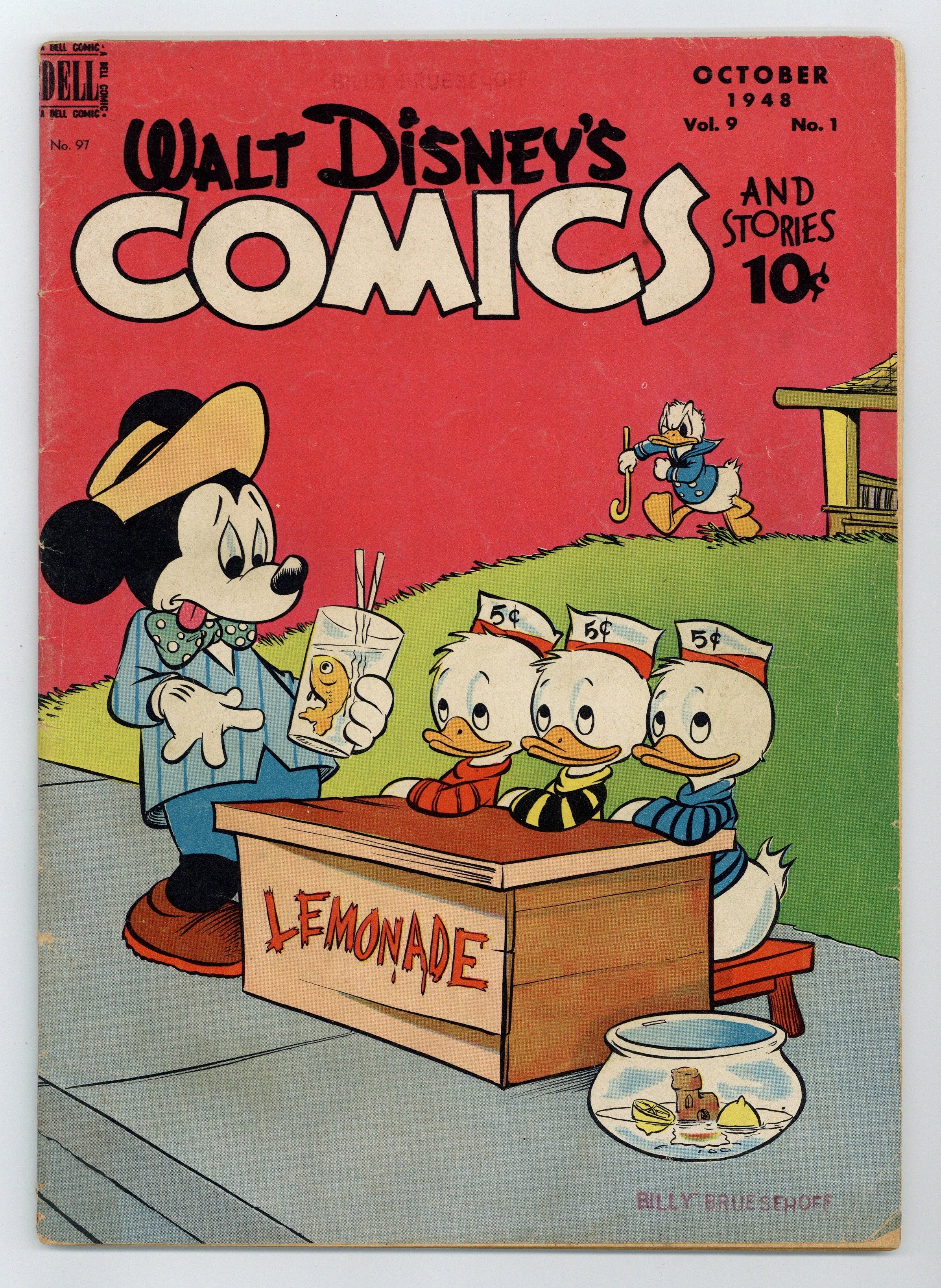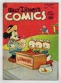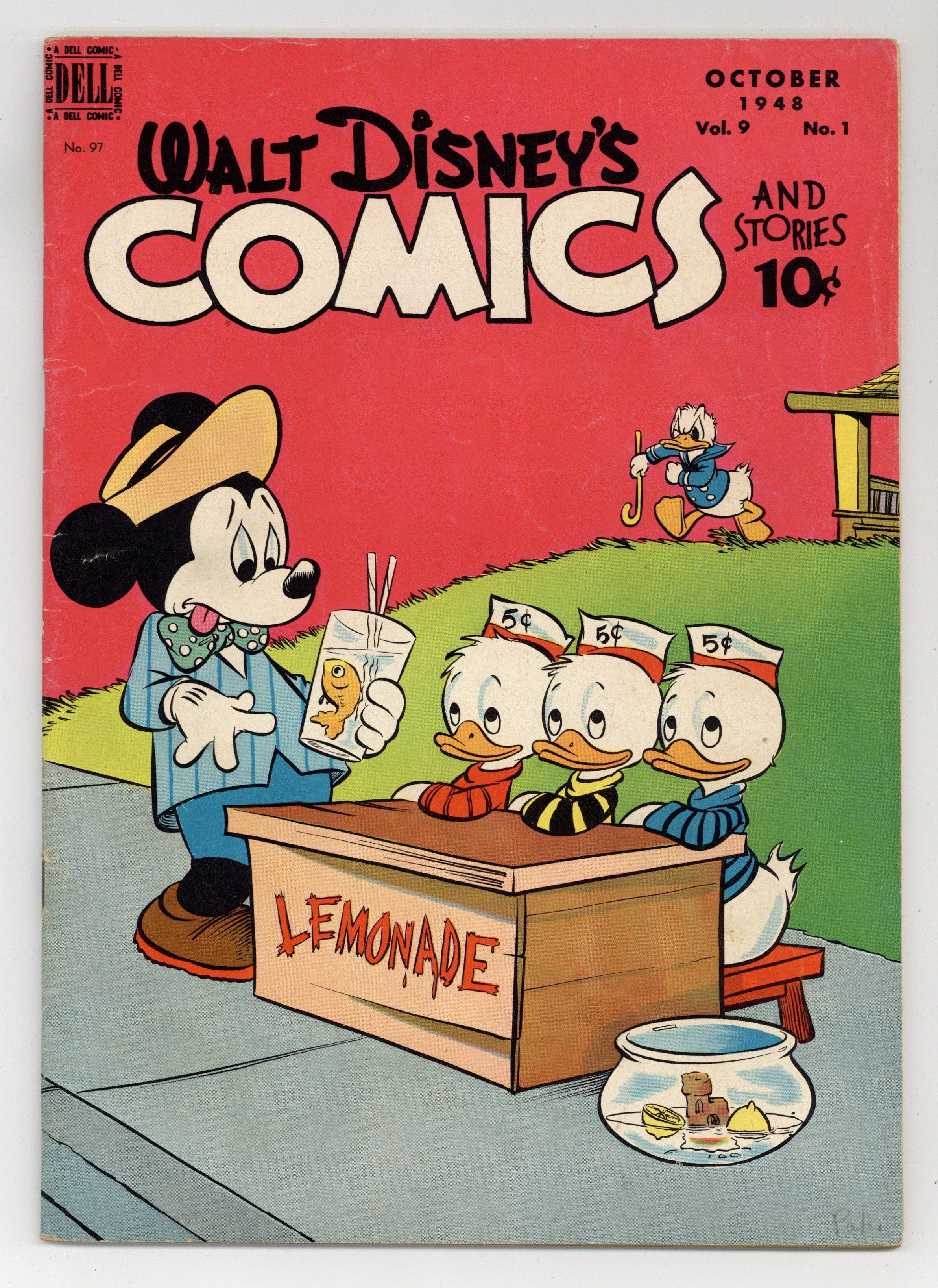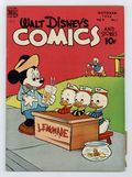 Cover by Walt Kelly. Stories and art by Carl Barks, Floyd Gottfredson, Bill Walsh, Dick Moores, Bob Karp, Hubie Karp, Ralph Heimdahl, Harvey Eisenberg, Gil Turner, Don Gunn, George Waiss, Bill Wright, Manuel Gonzales, and Al Taliaferro. Sometimes listed as Vol. 9 #1. The long-running vehicle for Disney character comics featured work by Carl Barks, Floyd Gottfredson, and Pogo's Walt Kelly. A young tugboat gets a chance to be a hero during a storm, in an adaptation of Little Toot from the Disney film Melody Time. In a story by Barks, Donald goes searching for pearls, but finds ball-bearings instead. Li'l Bad Wolf turns detective after chickens go missing. Donald Duck; Bucky Bug; Li'l Bad Wolf; Mickey Mouse; Plutos Surprise Package; Sea Salts; A Job for Grandma; Little Toot. 48 pages, Full Color. Cover price $0.10.