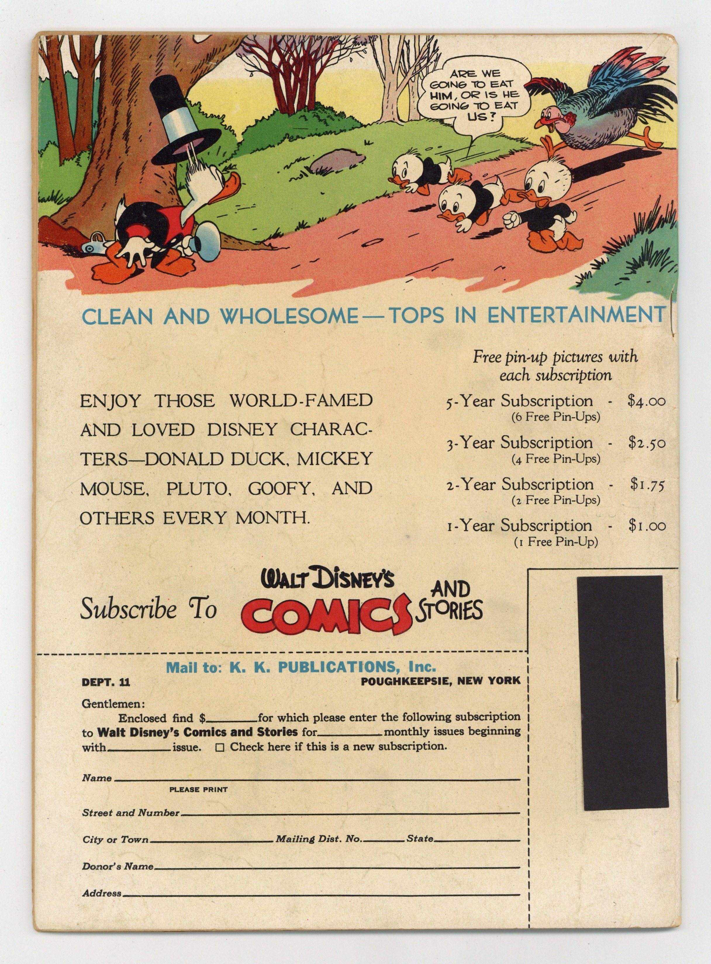 Cover by Walt Kelly. Stories and art by Carl Barks, Floyd Gottfredson, Bill Walsh, Dick Moores, Bob Karp, Ralph Heimdahl, Harvey Eisenberg, Don Gunn, George Waiss, Bill Wright, and Al Taliaferro. Sometimes listed as Vol. 9 #2. The long-running vehicle for Disney character comics featured work by Carl Barks, Floyd Gottfredson, and Pogo's Walt Kelly. In a classic story from the Mickey Mouse comic strip, Mickey gets amnesia and thinks he's a gangster! In a story by Barks, Donald goes hunting to prove his sportsmanship to Uncle Scrooge. This story features the first appearance of Uncle Scrooge in Walt Disney's Comics and Stories. Donald has to break into his own house - but it's the wrong house. Donald Duck; Bucky Bug; Li'l Bad Wolf; Mickey Mouse; Chip N Dale: Winter Storage; Plutos Sweater; Halloween Holdup; Mickey Mouse: Gangland. 48 pages, Full Color. Cover price $0.10.