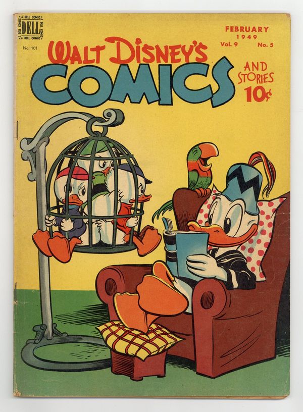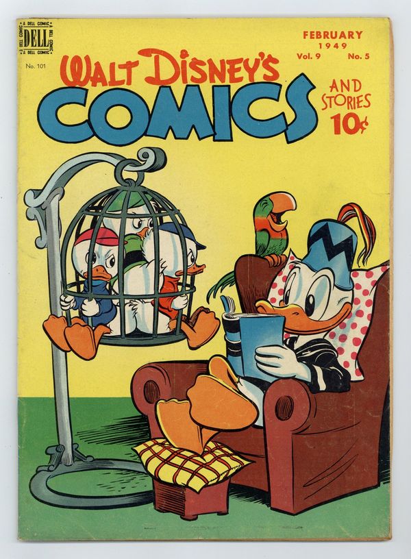 Cover by Walt Kelly. Stories and art by Carl Barks, Floyd Gottfredson, Bill Walsh, Dick Moores, Merrill De Maris, Bob Karp, Gil Turner, George Waiss, Bill Wright, Manuel Gonzales, and Al Taliaferro. Sometimes listed as Vol. 9 #5. The long-running vehicle for Disney character comics featured work by Carl Barks, Floyd Gottfredson, and Pogo's Walt Kelly. In a classic story from the Mickey Mouse comic strip, Mickey investigates stolen cameras, and encounters the supervillain called the Phantom Blot! This is the first appearance of the Phantom Blot in Walt Disney's Comics and Stories. In a story by Barks, the doctor orders Donald to crochet to get over his recurrent nightmares. Li'l Bad Wolf is enlisted to baby-sit Filbert the Elephant. Donald Duck; Bucky Bug; Li'l Bad Wolf; Mickey Mouse; The Schemers; Mickey Mouse Outwits the Phantom Blot. 48 pages, Full Color. Cover price $0.10.