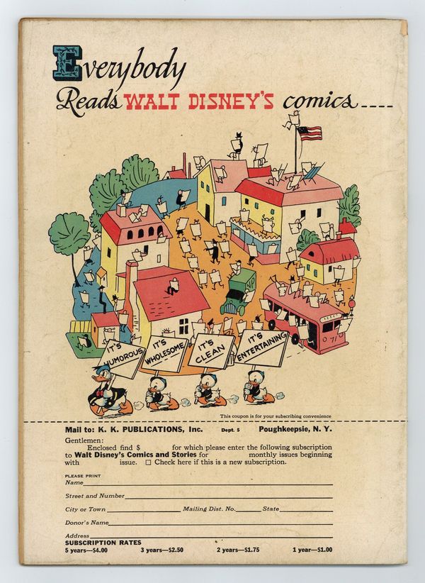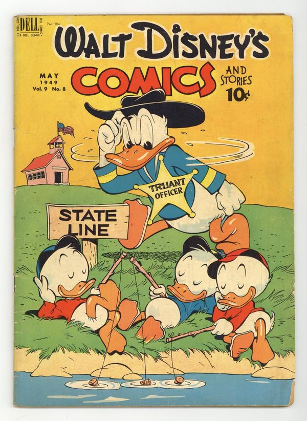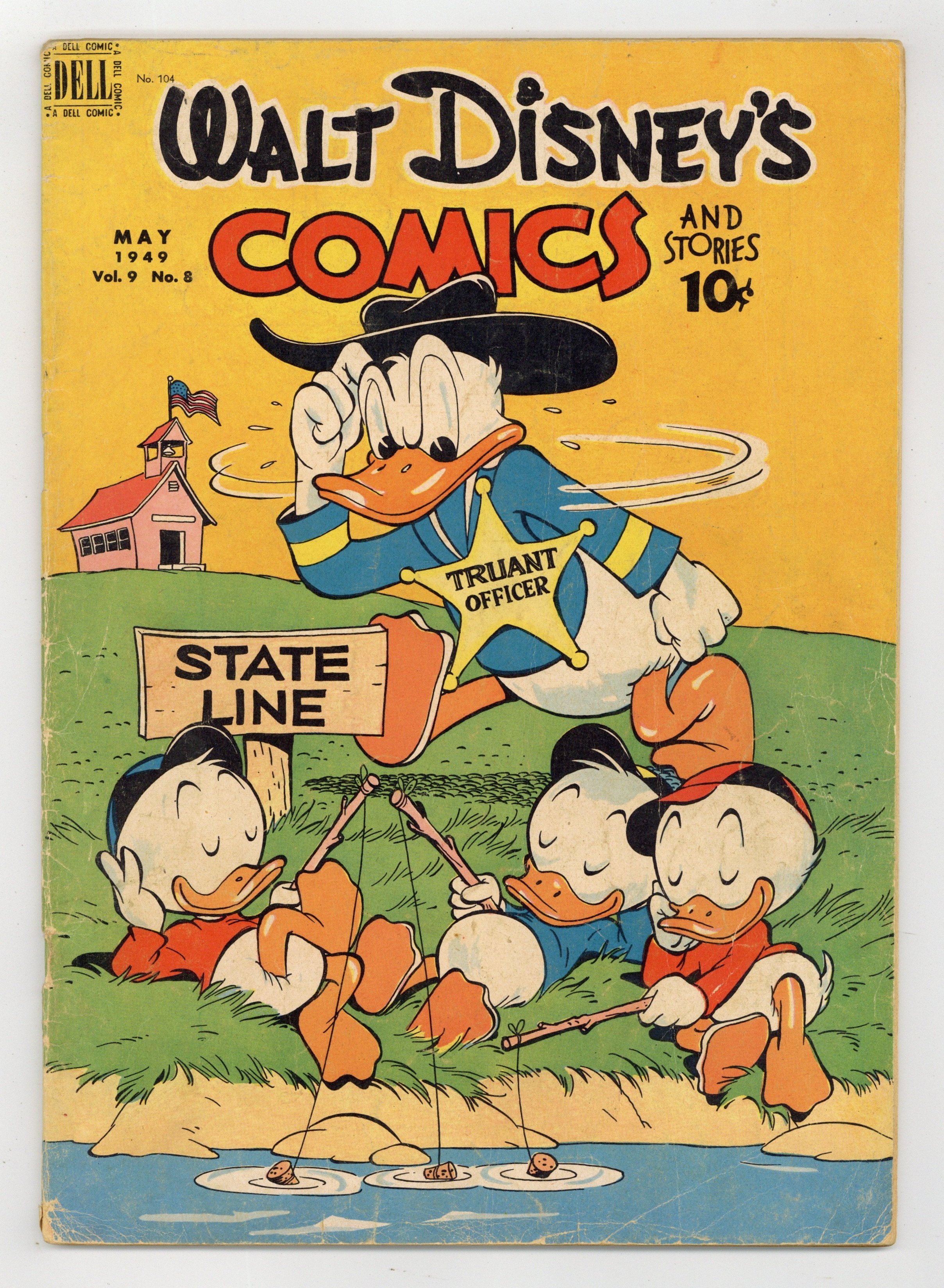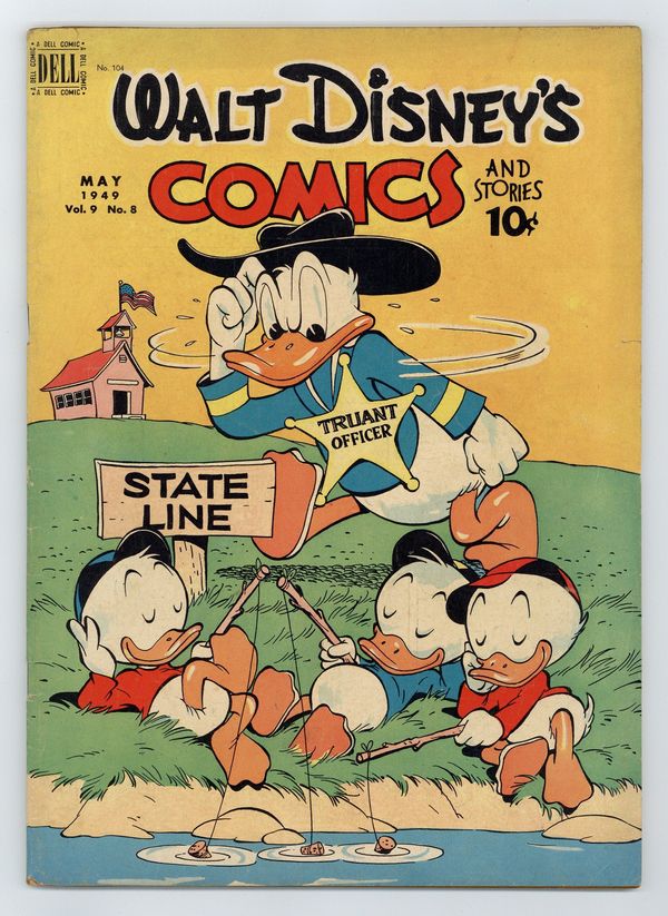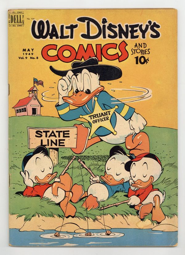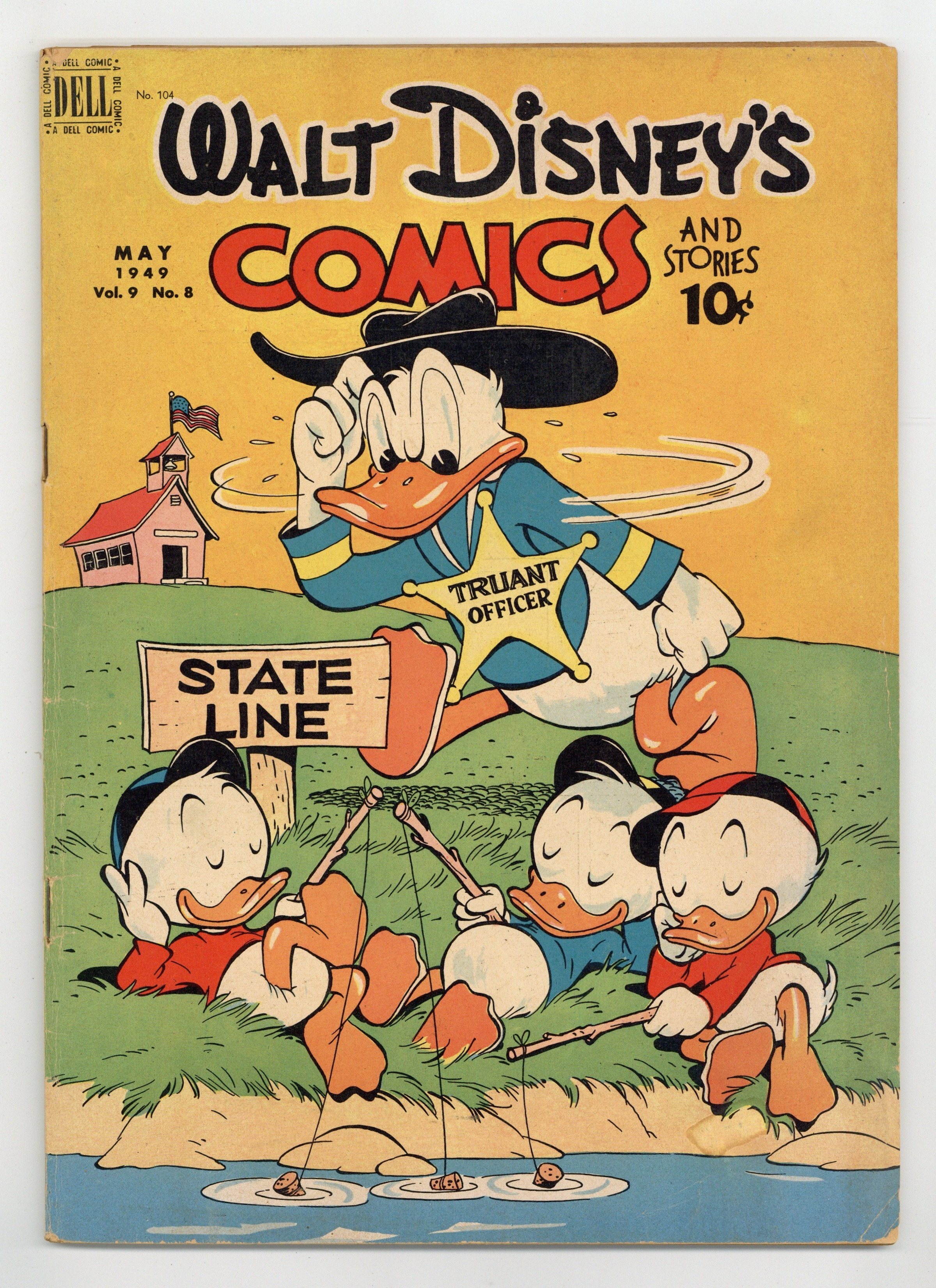 Cover by Carl Barks. Stories and art by Carl Barks, Floyd Gottfredson, Bill Walsh, Dick Moores, Bob Karp, Merrill De Maris, Tony Strobl, Gil Turner, George Waiss, Bill Wright, and Al Taliaferro. Sometimes listed as Vol. 9 #8. The long-running vehicle for Disney character comics featured work by Carl Barks, Floyd Gottfredson, and Pogo's Walt Kelly. In a classic story from the Mickey Mouse comic strip, Mickey tries to connect the Phantom Blot to the camera thefts. In a story by Barks, Donald figures out how to raise Uncle Scrooge's sunken yacht by filling it with ping-pong balls. This story has since become the center of various urban legends, a patent case, and even an episode of the Mythbusters TV series. Donald Duck; Bucky Bug; Li'l Bad Wolf; Mickey Mouse; Dumbo the Flying Elephant; Easter Eggs; Mickey Mouse Outwits the Phantom Blot. 48 pages, Full Color. Cover price $0.10.