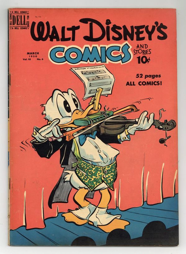 Tags: Disney Ducks & MicePublished Mar 1950 by Dell/Gold Key.$21.00Cover by Walt Kelly. Stories and art by Carl Barks, Floyd Gottfredson, Bill Walsh, Merrill De Maris, Bob Karp, Gil Turner, Tony Strobl, George Waiss, Bill Wright, Manuel Gonzales, and Al Taliaferro. Sometimes listed as Vol. 10 #6. The long-running vehicle for Disney character comics featured work by Carl Barks, Floyd Gottfredson, and Pogo's Walt Kelly. In a classic story from the Mickey Mouse comic strip, Mickey meets an undercover Fed while seeking Clarabelle in the North Woods, but Pete and Shyster are scheming against him. In a story by Barks, Donald must elude foreign spies while delivering medicine to a remote village by skis. Mickey takes an unruly Pluto to canine charm school. Donald Duck; Bucky Bug; Li'l Bad Wolf; Mickey Mouse; The Hibernating Rug; Mickey Mouse in the Mystery at Hidden River. 48 pages, Full Color. Cover price $0.10.