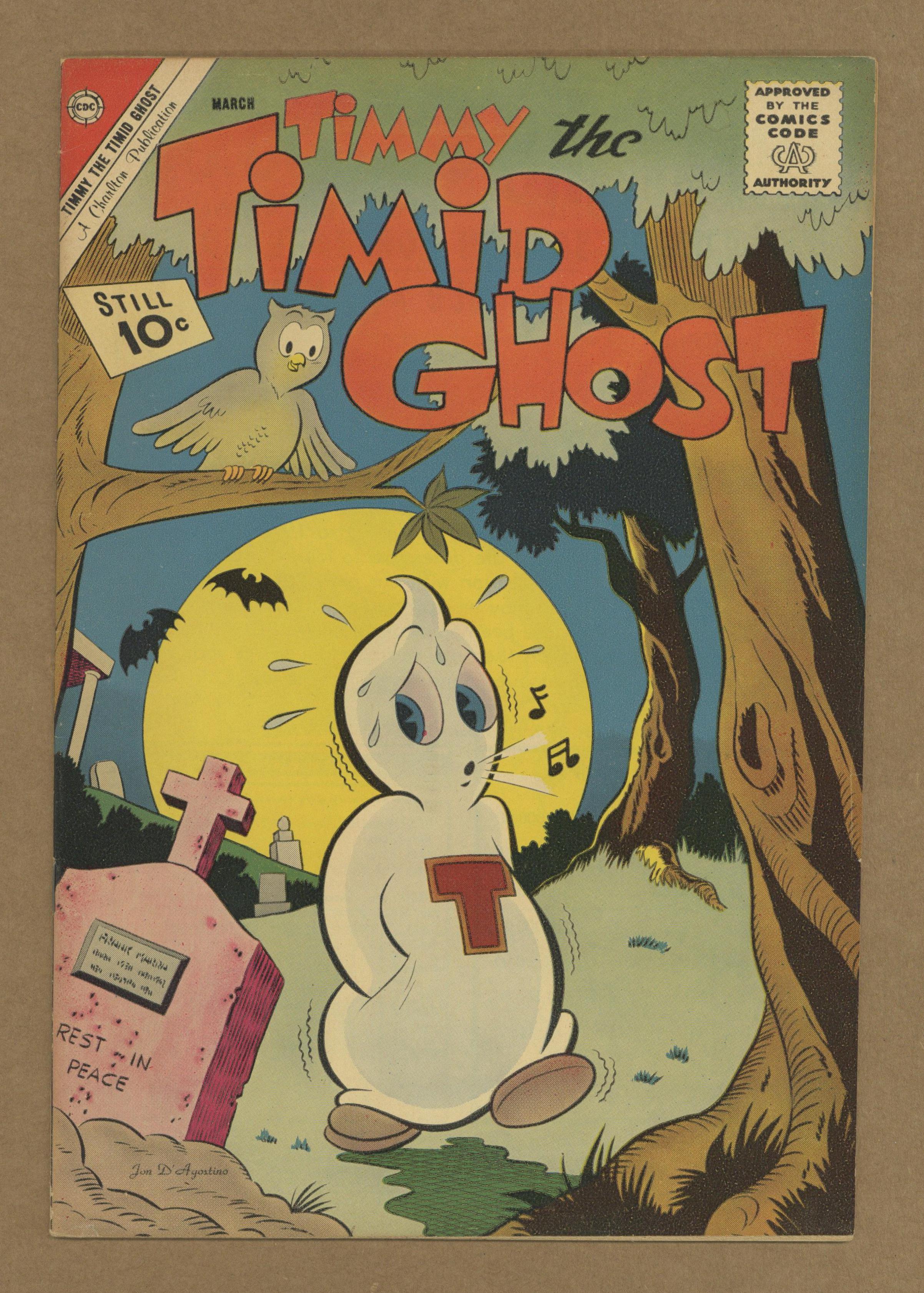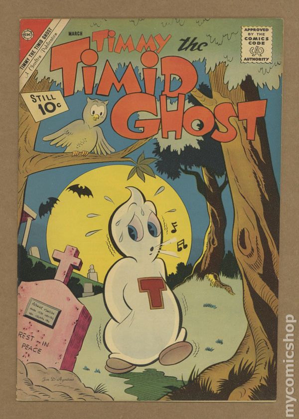 Published Mar 1962 by Charlton Comics Group.$6.00Cover by Jon D'Agostino. Stories and art by George Wildman and others. A poor man's Casper, Timmy is not merely misunderstood; he's actively afraid of everything. Timmy gets a job haunting a carnival funhouse, but the other monsters don't want anyone new. Maxie and Timmy go looking for Wilma the witch after she disappears in the Terrible Woods. But that takes them on a quest to a princess and a magical castle. Miss Dolly attends the auction after she loses her house, and there's a surprise winner. The Mischievous Magician; Willie the Worm; The Persistent Bidder. 32 pages, Full Color. Cover price $0.10.