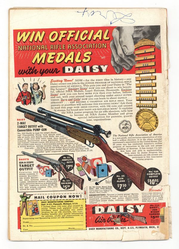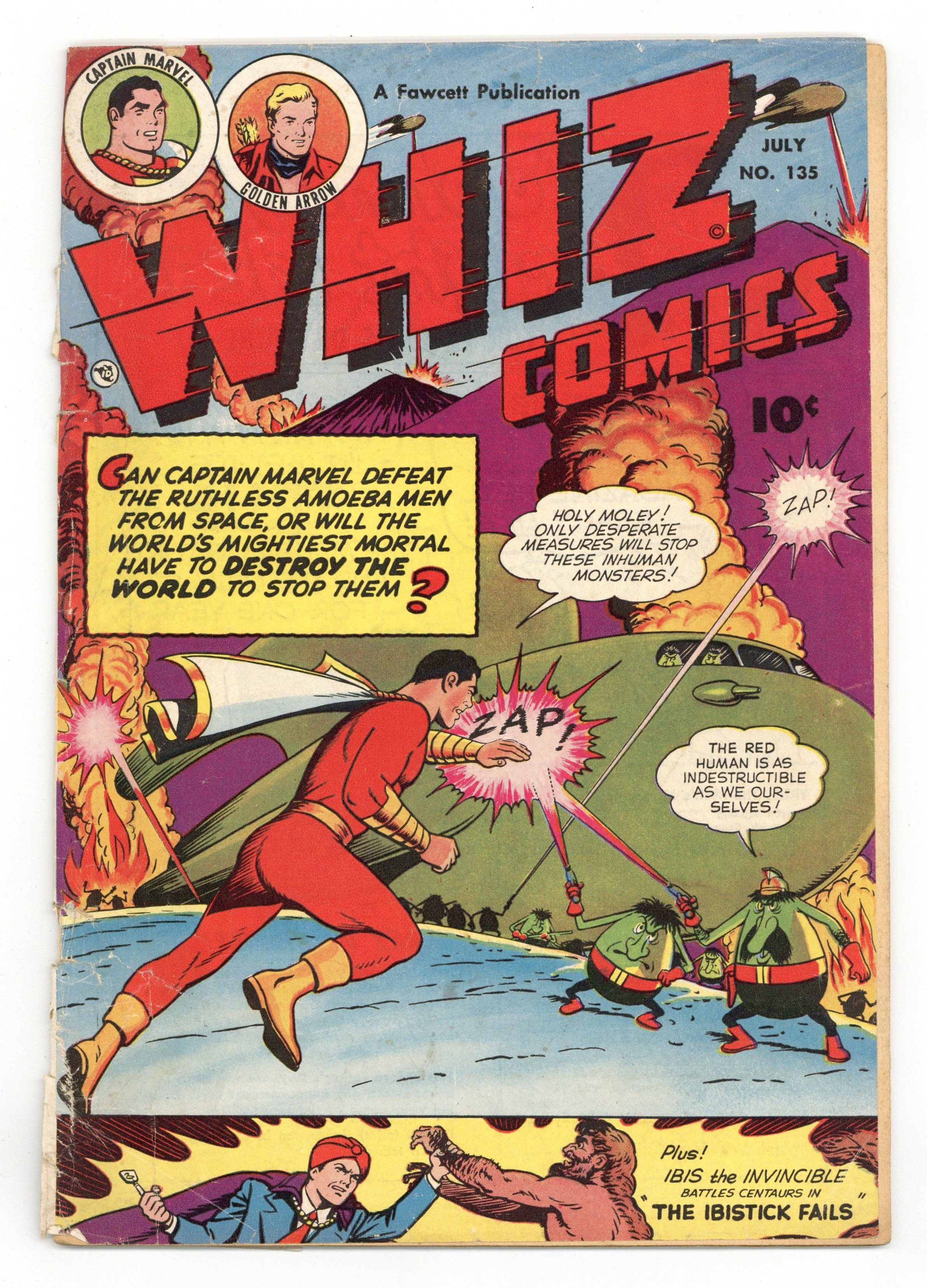 Cover by Kurt Schaffenberger. Stories and art by Otto Binder, Walter Palais, Anthony Cataldo, Bill Woolfolk and Kurt Schaffenberger. The Fawcett comic that introduced the original Captain Marvel (Shazam) to the world. When the ruthless amoeba men from space invade the Earth, the World's Mightiest Mortal realizes he may have to destroy the world to stop them. When a man is framed for murder, it's a matter for the law, but when he then escapes jail, it's a job for Golden Arrow. A sculptor brings the statue of a centaur to life, and when Ibis tries to restore the natural order, his Ibistick fails. Captain Marvel Destroys the World; Colonel Corn and Korny Kobb; Golden Arrow: The Frame-Up; Wicky and O'Shawnessy; Ibis the Invincible: The Ibistick Fails. 32 pages, Full Color. Cover price $0.10.