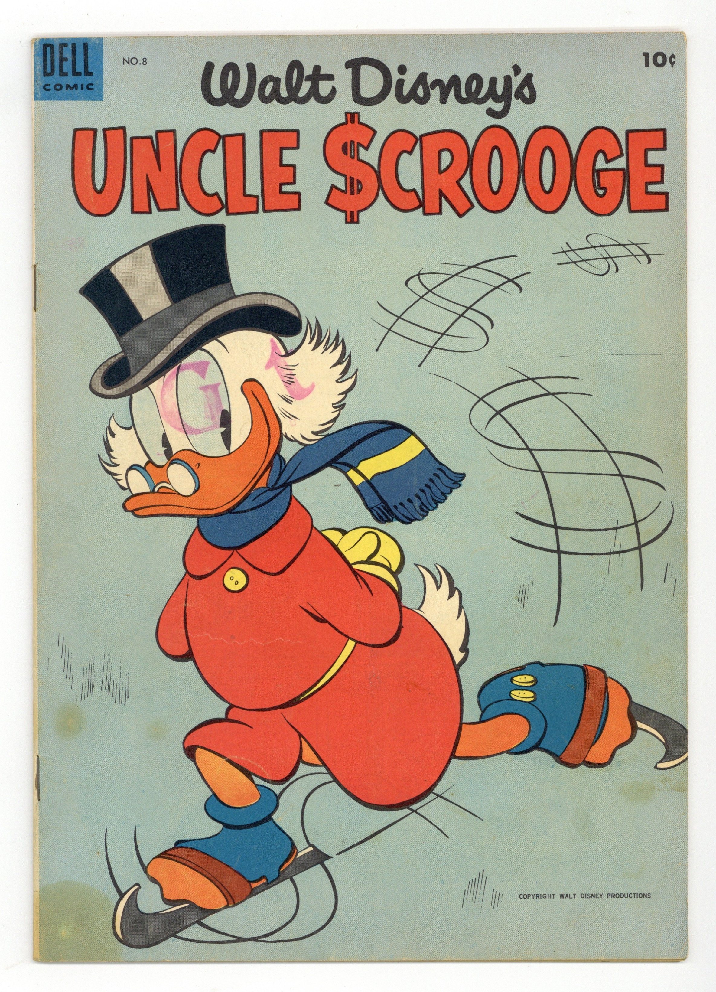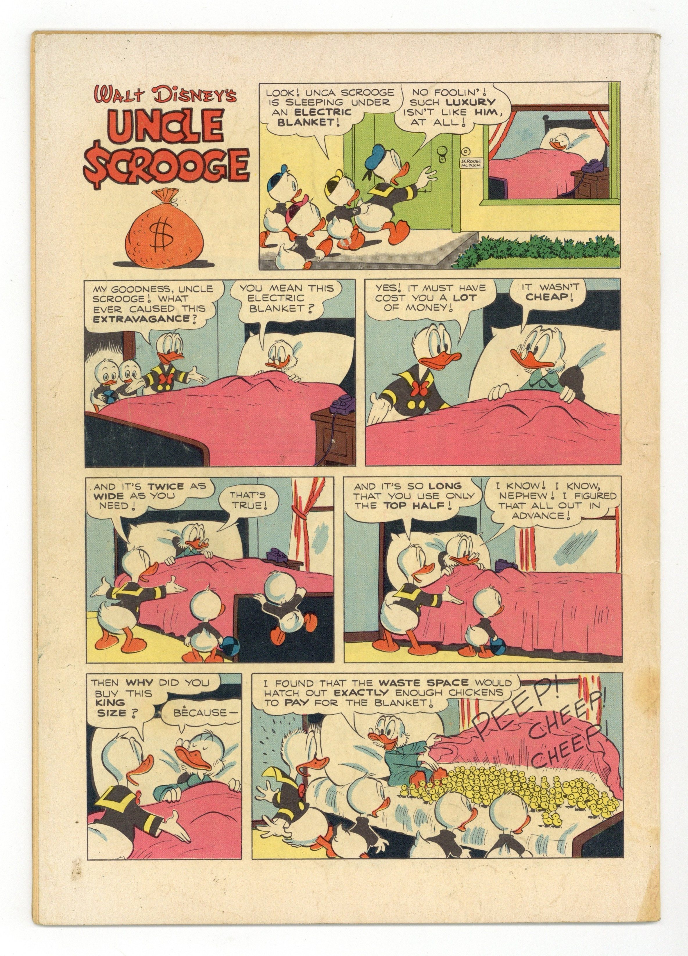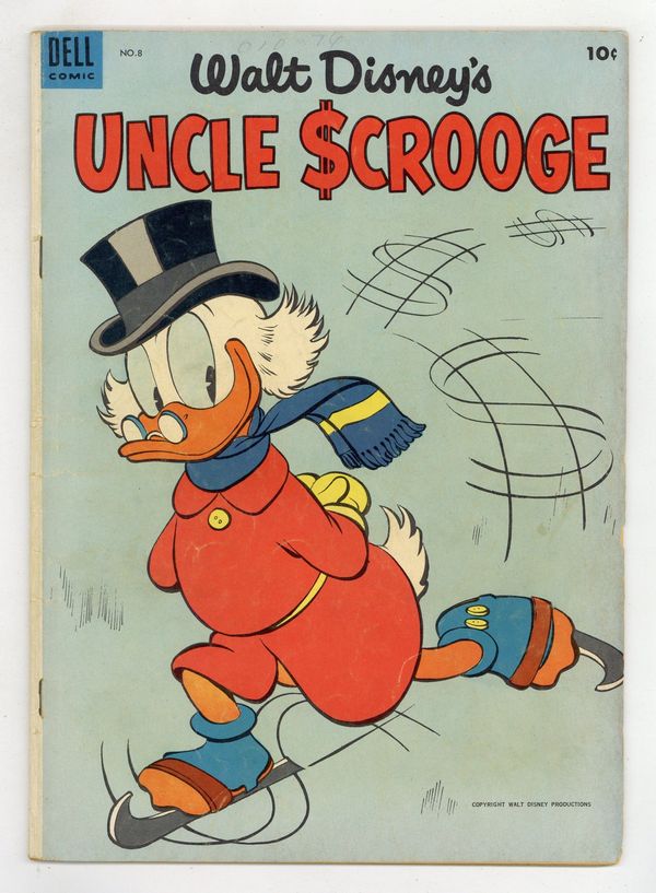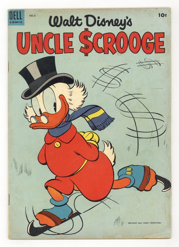 Cover by Carl Barks. Stories and art by Carl Barks. Comics legend Carl Barks creates his masterpiece, featuring the adventures of Donald Duck's Uncle Scrooge, the richest duck in the world. Scrooge and his nephews respond to a message in a bottle and visit a mysterious island. But when they arrive, they find the Beagle Boys, and a strange ray that turns living things into stone. Scrooge makes extra money by renting out his limousine as a taxi on a rainy day. Scrooge wants to run for treasurer of Duckburg, but he doesn't want to spend the money for a campaign. Message from Mysterious Island; A Campaign of Note; Classy Taxi!; Blanket Investment. 32 pages, Full Color. Cover price $0.10.