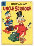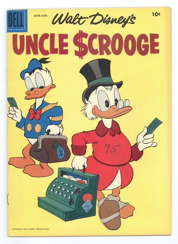 10¢ Edition. Cover by Carl Barks. Stories and art by Carl Barks and Harvey Eisenberg. Comics legend Carl Barks creates his masterpiece, featuring the adventures of Donald Duck's Uncle Scrooge, the richest duck in the world. Scrooge, taking a break from his money in a remote cabin, learns about The King of the Golden River and generosity. Gyro's mind-reading machine seems stumped by a simple bird. Scrooge's car is so old, he has to go to the museum when he needs parts!Going to Pieces; The Golden River; The Art Collectors; Gyro Gearloose: The Know-It-All Machine; High Rider; That Sinking Feeling. 32 pages, Full Color. Cover price $0.10.