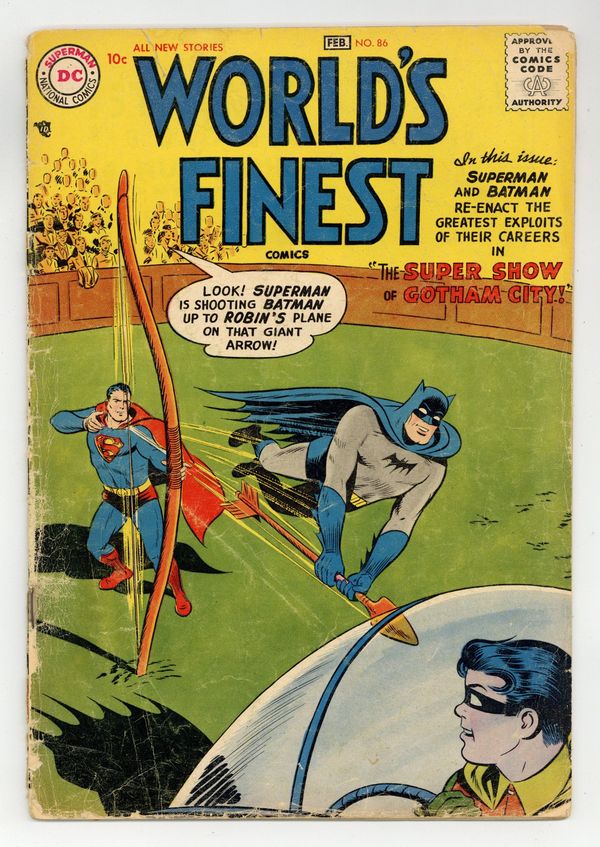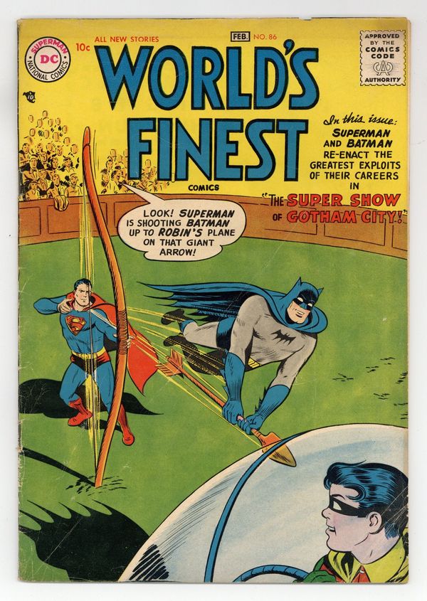 Cover pencils by Curt Swan, inks by Stan Kaye. The Super-Show of Gotham City, script by Edmond Hamilton, pencils by Dick Sprang, inks by Stan Kaye; Superman, Batman and Robin are putting on a show for charity, but someone keeps sabotaging the performance. Jerry the Jitterbug humor page by Henry Boltinoff. The Cherokee Storm Raiders starring Tomahawk, script by Dave Wood, art by Bob Brown. The Day I Became A Lion Tamer text story. 1,000 Arrows to Doom starring Green Arrow, script by Dave Wood, art by George Papp; A millionaire offers to donate $100 to charity for each arrow Green Arrow shoots in a day. 36 Pages, Full Color. Cover price $0.10.