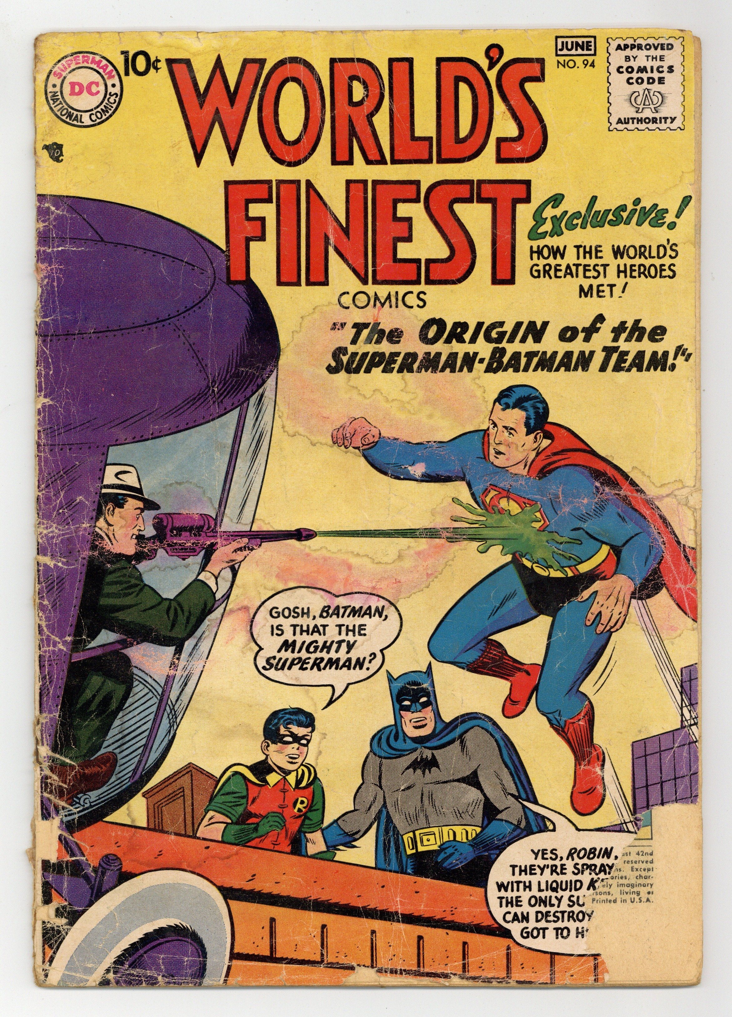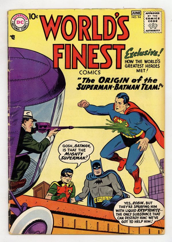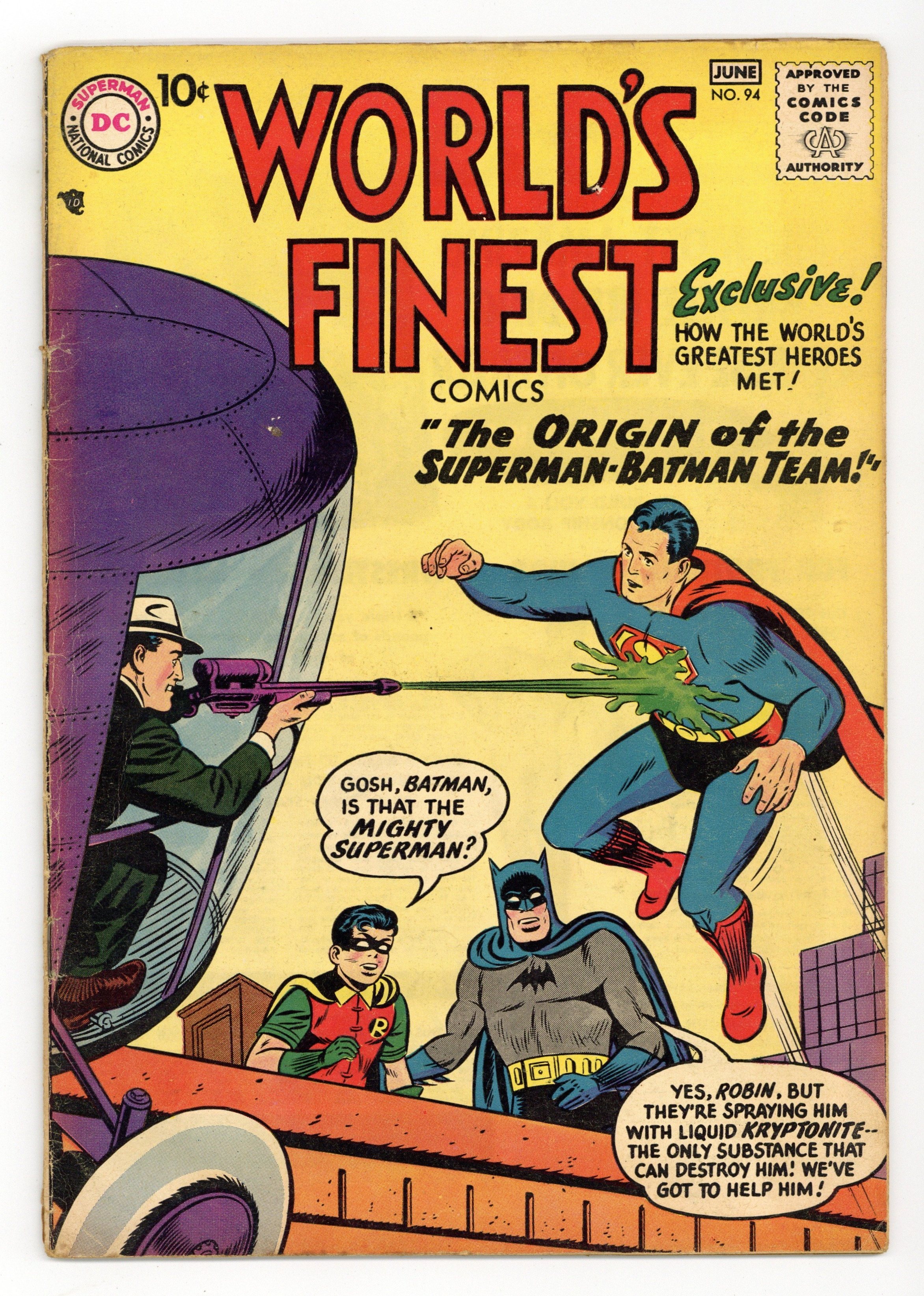 Green Arrow. Origin of Superman/Batman team retold. Cover pencils by Curt Swan and Sheldon Moldoff (Batman figure), inks by Stan Kaye and Sheldon Moldoff (Batman figure). Origin of the Superman Batman Team, script by Edmond Hamilton, pencils by Dick Sprang, inks by Stan Kaye; When Luthor develops a liquid kryptonite gun, Superman replaces Batman with a new partner, Powerman. Batman reminisces about their first team-up. Doctor Rocket humor two-pager by Henry Boltinoff. The Frontier Census-Taker starring Tomahawk, art by Fred Ray. Look Back At Bowling text article. The Taming of the Wild Bunch, pencils by Carmine Infantino, inks by John Belfi. The Rocket Raiders starring Green Arrow, art by George Papp. That Deep, Dark Secret public service announcement starring Buzzy, script by Jack Schiff, art by Win Mortimer. 36 Pages, Full Color. Cover price $0.10.