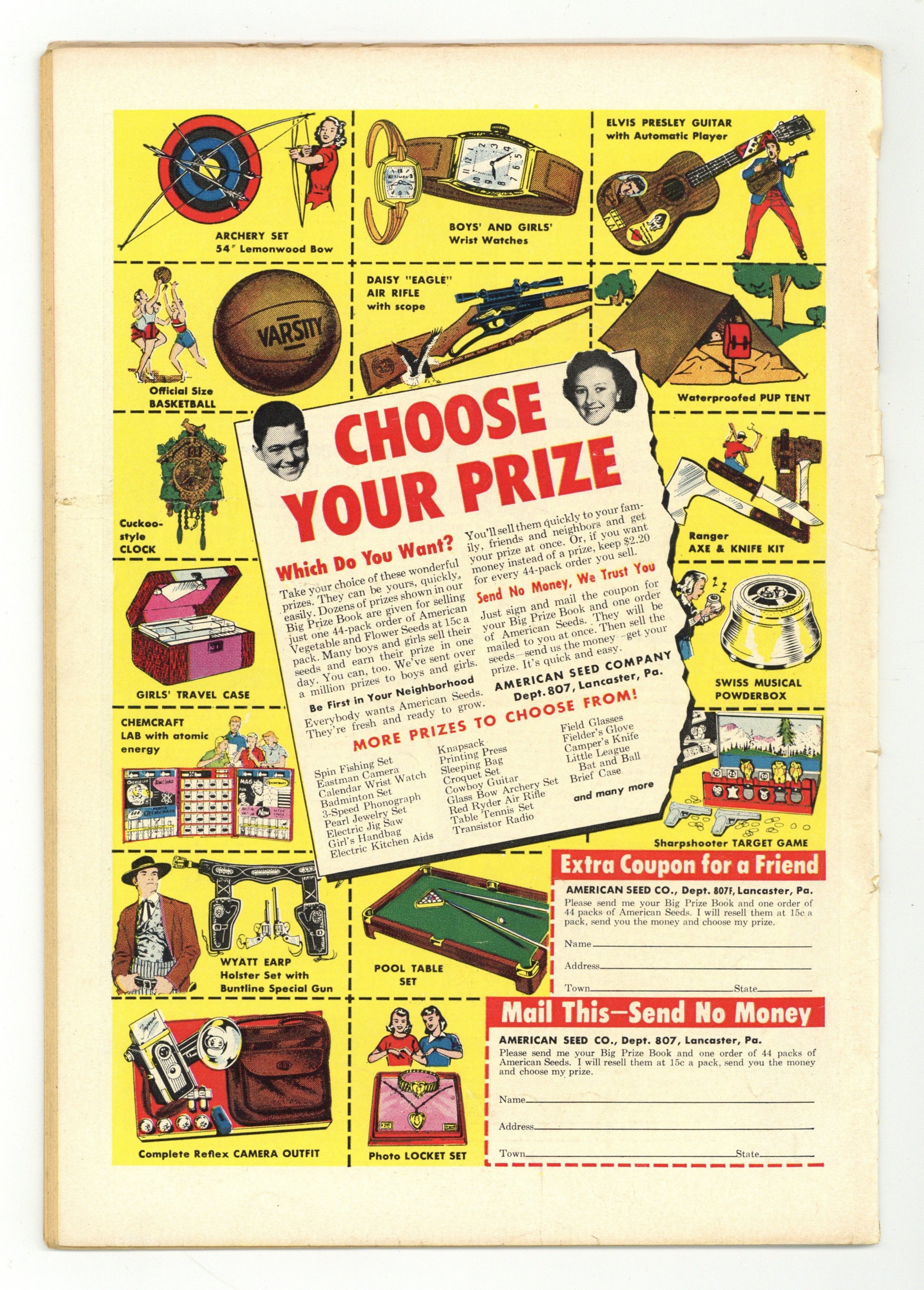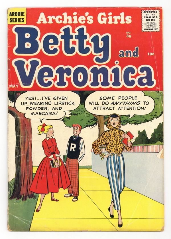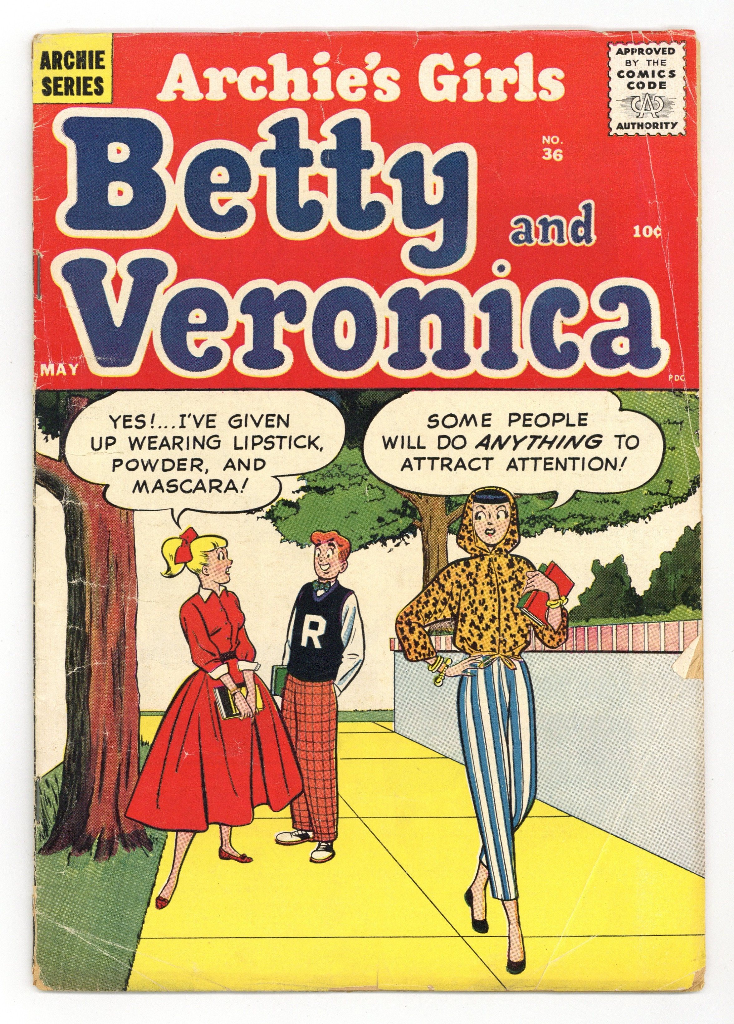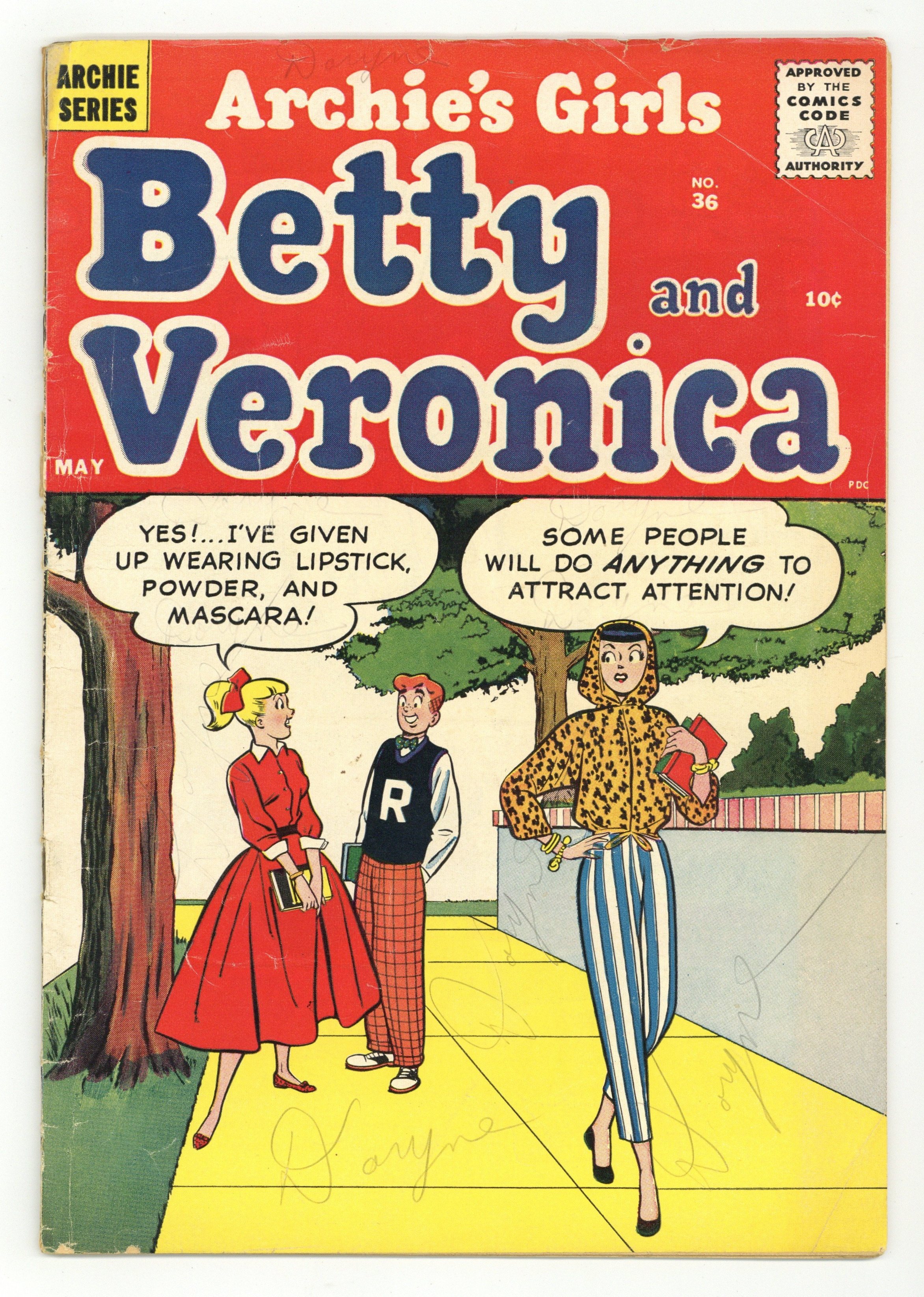 Cover pencils by Harry Lucey, inks by Terry Szenics. Ducat Dupes, script by Frank Doyle, pencils by Dan DeCarlo, inks by Rudy Lapick; Betty tells Jughead that she's found a wallet with two tickets to the annual country club ball. Witch Switch; Archie sets Betty up on a date with his cousin. Wiltin' Dilton; Dilton is frightened by a TV program. Horror Scope; Veronica won't go out with Archie because her horoscope says to stay inside. 36 pgs. $0.10. Cover price $0.12.