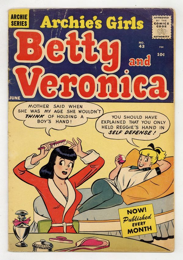 Cover pencils by Harry Lucey, inks by Martin Epp. "Fickle Father," pencils by Dan DeCarlo, inks by Rudy Lapick; Mr. Lodge gets Betty to pick out clothes to buy as a gift from him to Veronica. "Ricky Nelson" Record Star of the Month; Biography of Ricky Nelson. "Who's Whose?", art by Tom Moore; Archie tries to get the name of Betty's dining companion. "Mask-Her-Aid," pencils by Dan DeCarlo, inks by Rudy Lapick; Jughead offers to get Betty closer to Archie by having her pretend to be Veronica at a masquerade party. "Shivering Chivalry," script by Frank Doyle, pencils by Dan DeCarlo, inks by Rudy Lapick; Betty and Veronica ask Reggie and Archie to protect them from two kids with pea shooters. Betty Fun Page. "The Sight," script and art by Joe Edwards; Jinx looks through the scope of her rifle. "Dollars and Scents," script by Frank Doyle, pencils by Dan DeCarlo, inks by Rudy Lapick; The perfume Jughead gave Betty for Christmas smells awful. 36 pgs., full color. Cover price $0.12.