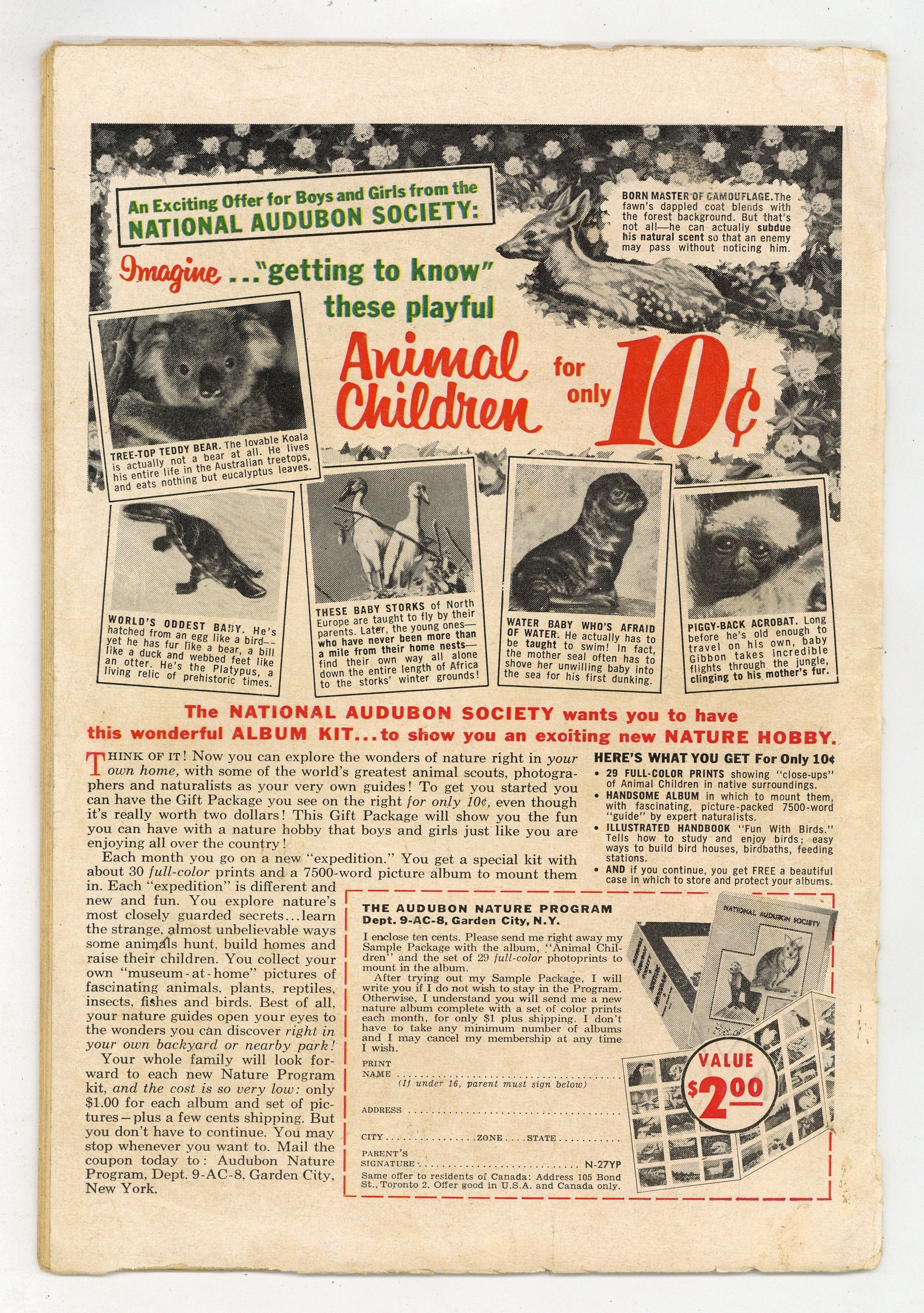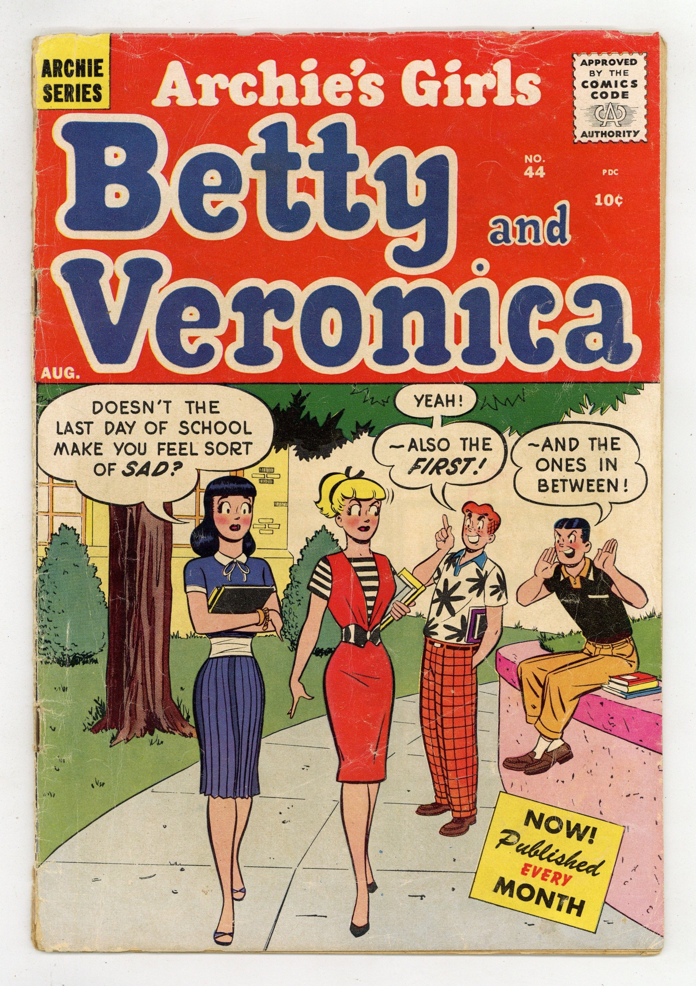 Cover pencils by Harry Lucey, inks by Terry Szenics. "School Daze," pencils by Dan DeCarlo, inks by Rudy Lapick; With the end of term impending, Betty and Veronica go around the school browbeating the other students into not thinking it's a good thing as a favor to Miss Grundy. "Elvis Presley" Betty Presents the Star of the Month; Short biography of singer Elvis Presley. "A Pat Hand," pencils by Dan DeCarlo, inks by Rudy Lapick; Veronica thinks Reggie is double-jointed. "Subject to Failing," pencils by Dan DeCarlo, inks by Rudy Lapick; The good news is that Veronica didn't fail Algebra. "Sheep Skinned," script by Frank Doyle, pencils by Dan DeCarlo, inks by Rudy Lapick; Jughead and the other boys accuse the girls of being "sheep" because they always start wearing the latest fashions, whether or not the boys find those new fashions appealing. "Designing Woman," pencils by Dan DeCarlo, inks by Rudy Lapick; When Betty shows off the dress she made herself, and it turns out to be a duplicate of the dress Veronica just bought from Paris, Veronica decides to make sure that Betty never wears that dress. "Third-Class Male"; Jughead gets a little revenge for having to stand in a postal line behind two gossiping women. "All Cracked Up," script and art by Joe Edwards (as Joe Harold); Jenkins has an appointment to keep. "One Big Pane," script by Frank Doyle, pencils by Dan DeCarlo, inks by Rudy Lapick; Betty and Veronica attempt to convince Archie that an empty window frame actually contains a pane of glass. 36 pgs., full color. Cover price $0.12.