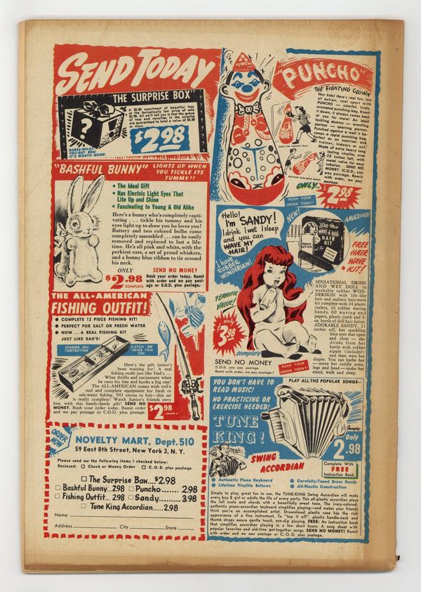 Tags: Pre-Code Horror$93.00- Centerfold detached at one staple. Cover oxidation with chipping.