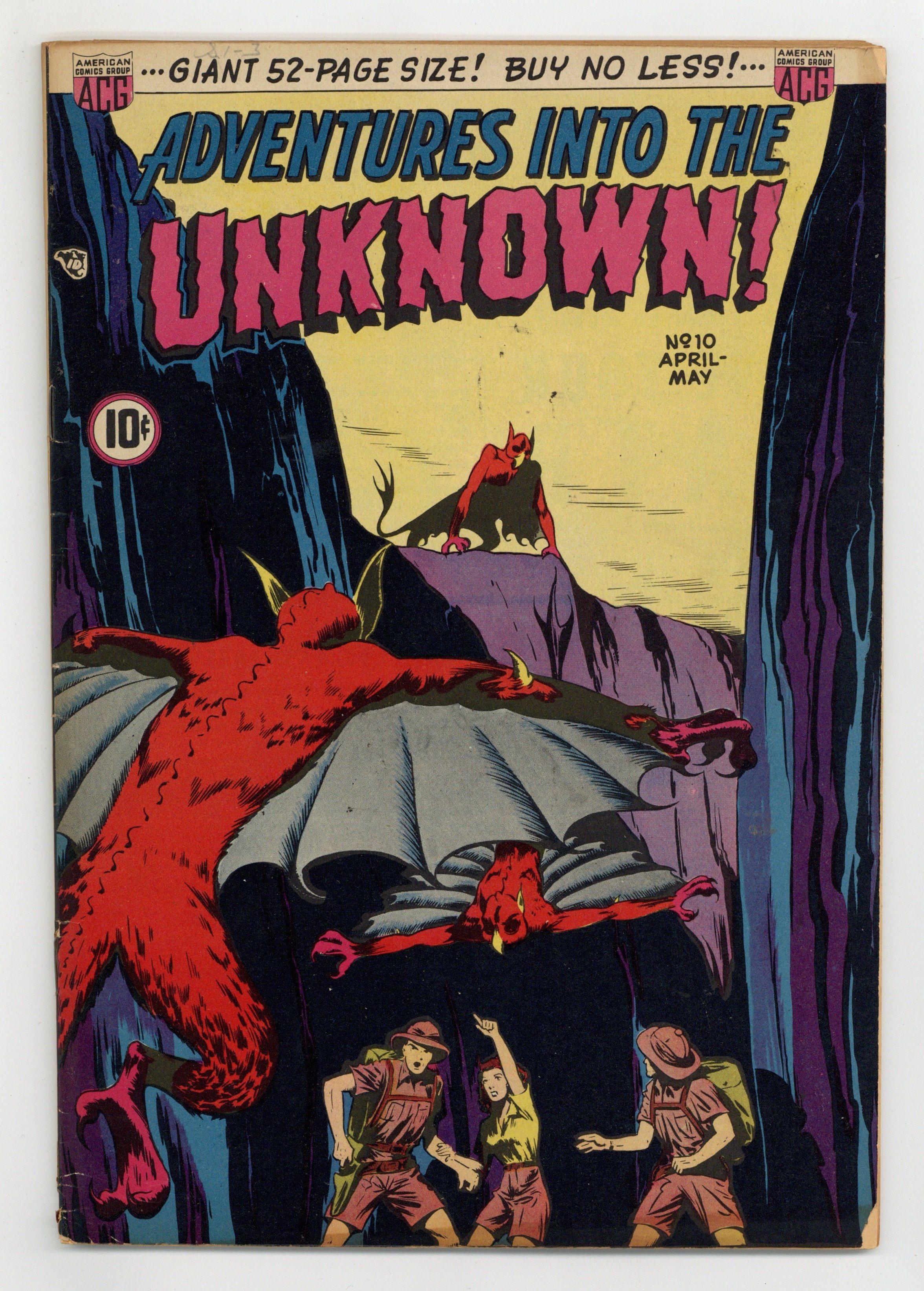 Edited by Richard E. Hughes. Cover by Edvard Moritz. Stories by Edvard Moritz, George Klein, Pete Riss, Charlie Sultan, Bob Lubbers, and John Celardo. Spine-chilling tales of suspense, horror, and the supernatural—prepare yourself for Adventures into the Unknown! 52 pages, full color. $0.10. Cover price $0.10.