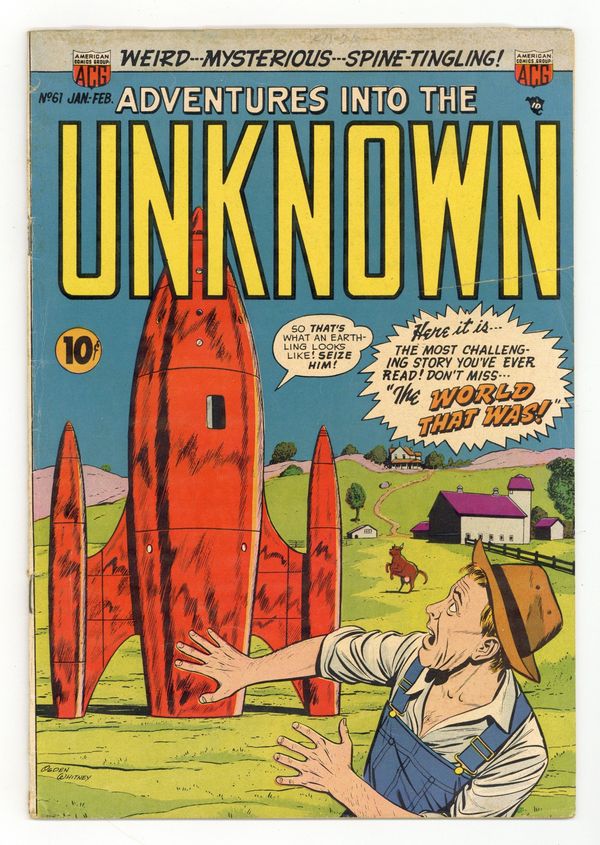 Tags: Pre-Code Horror$225.00Edited by Richard E. Hughes. Cover by Ogden Whitney. Stories by Ken Landau, Ogden Whitney, John Rosenberger, and Harry Lazarus. Spine-chilling tales of suspense, horror, and the supernatural—prepare yourself for Adventures into the Unknown! 36 pages, full color. $0.10. Cover price $0.10.