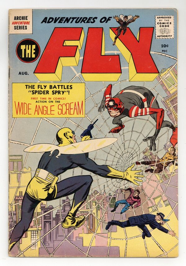 Published Aug 1959 by Archie Publications.$170.00This series is titled "Adventures of the Fly" from issue 1 to issue 30. Edited by John Goldwater. Cover by Joe Simon and Jack Kirby. Stories by Joe Simon, Jack Kirby, George Tuska, and Bill Draut. Archie Comics amiable and agile super-hero The Fly battles an assortment of nefarious villains, including arch foe Spider Spry. Includes origin story. Includes an adventure starring The Shield as well. 36 pages, full color. $0.10. Cover price $0.10.