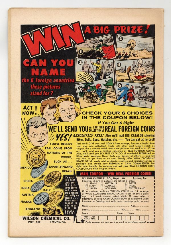 Published Aug 1959 by Archie Publications.$14.50- INCOMPLETE. Multiple ad pages missing, does not interrupt art or story. Full length spine split with tape. Cover detached. Cover oxidation with brittle paper. Water damage.