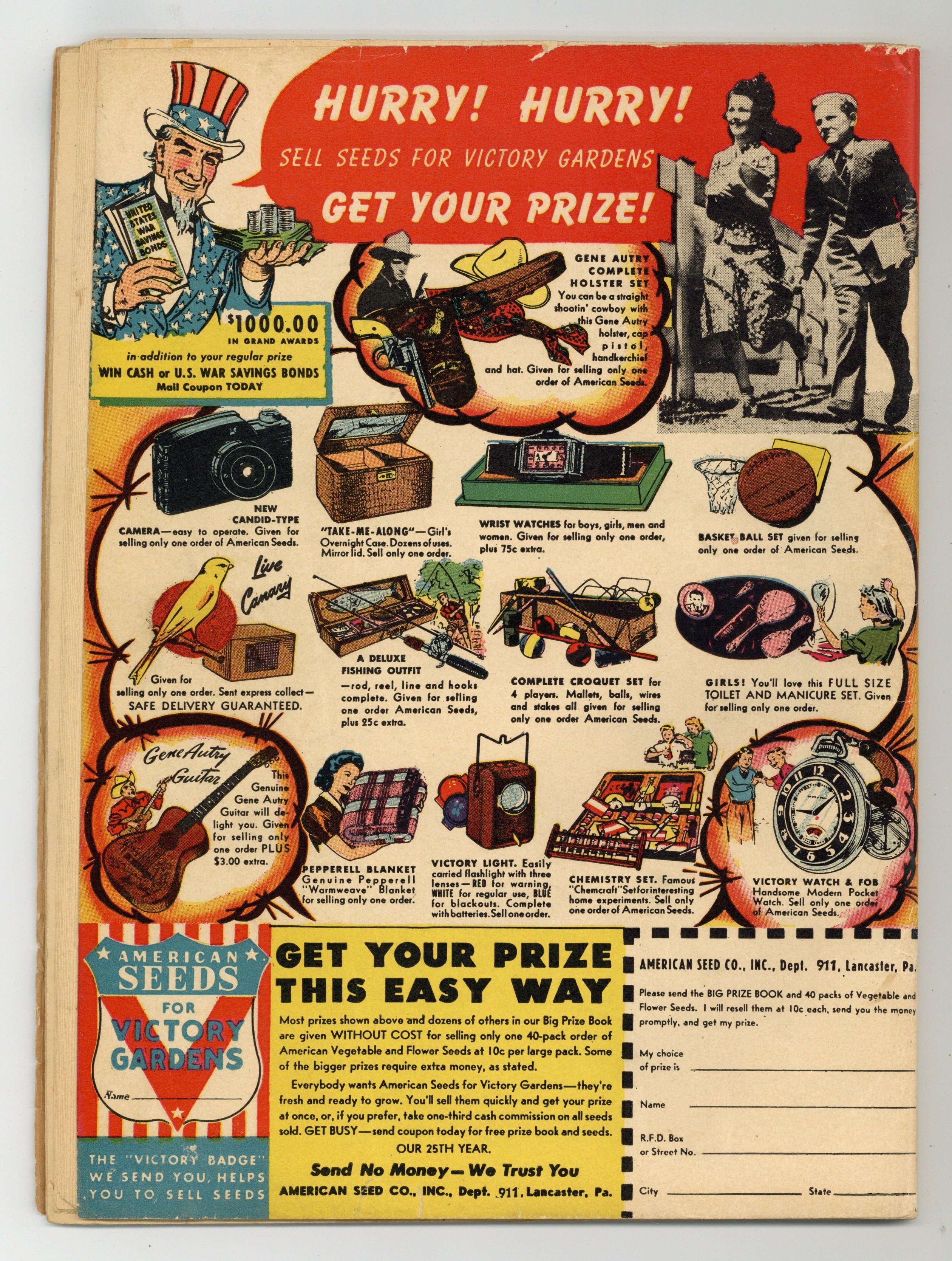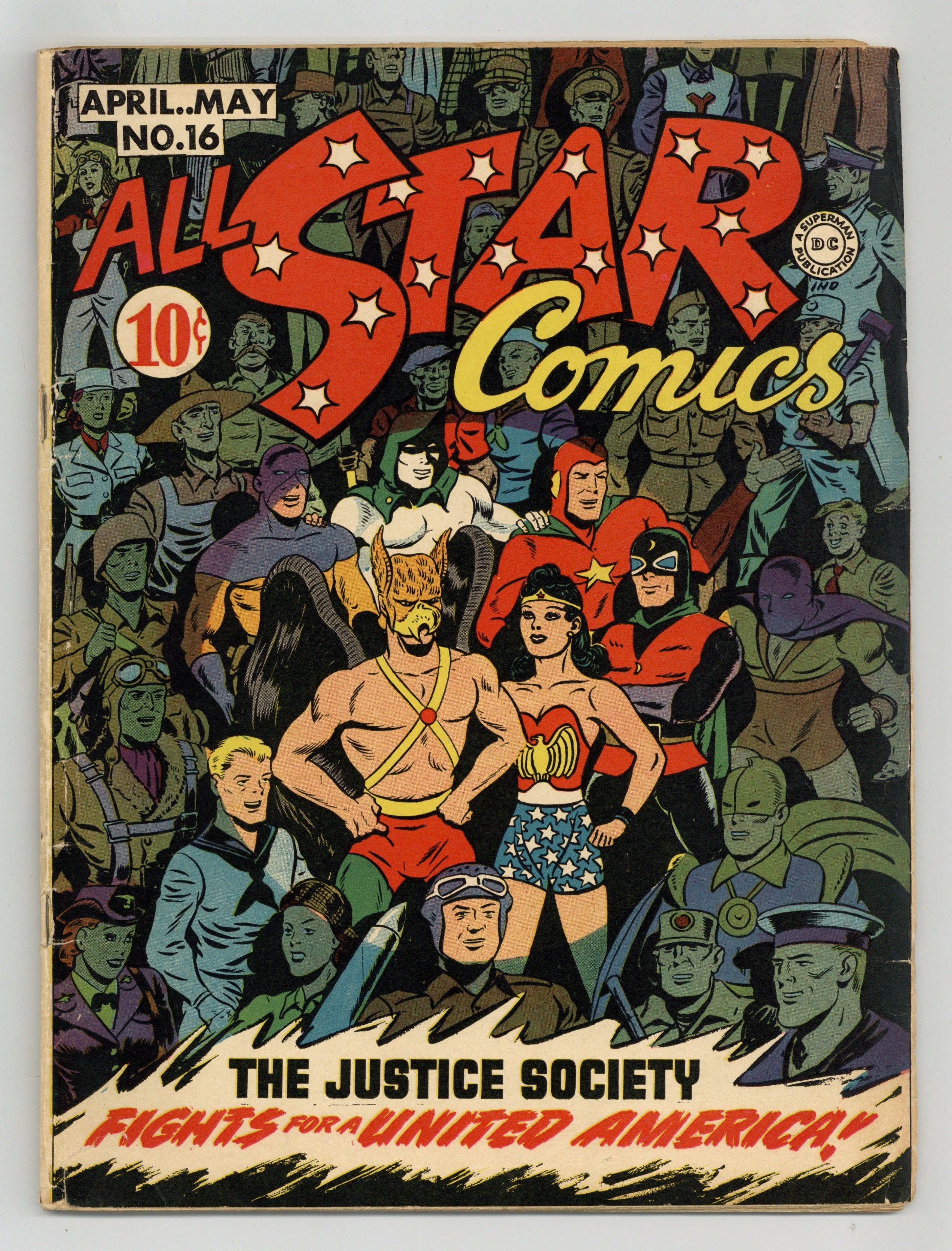 The Justice Society of America "Fights for a United America!" Plot by Gardner Fox and Sheldom Mayer, script by Fox. Art by Joe Gallagher plus individual chapters featuring Hawkman (art by Sheldon Moldoff), Dr. Mid-nite (art by Stan Aschmeier), the Atom (art by Gallagher), Doctor Fate (art by Howard Sherman), the Sandman (art by Joe Simon and Jack Kirby), Starman (art by Ed Dobrotka), the Spectre (art by Bernard Baily), and Johnny Thunder (art by Aschmeier). Wonder Woman appearance. Two-page Hop Harrigan text story, "Secret Weapon." Frank Harry cover. 68 Pages, Full Color. Cover price $0.10.