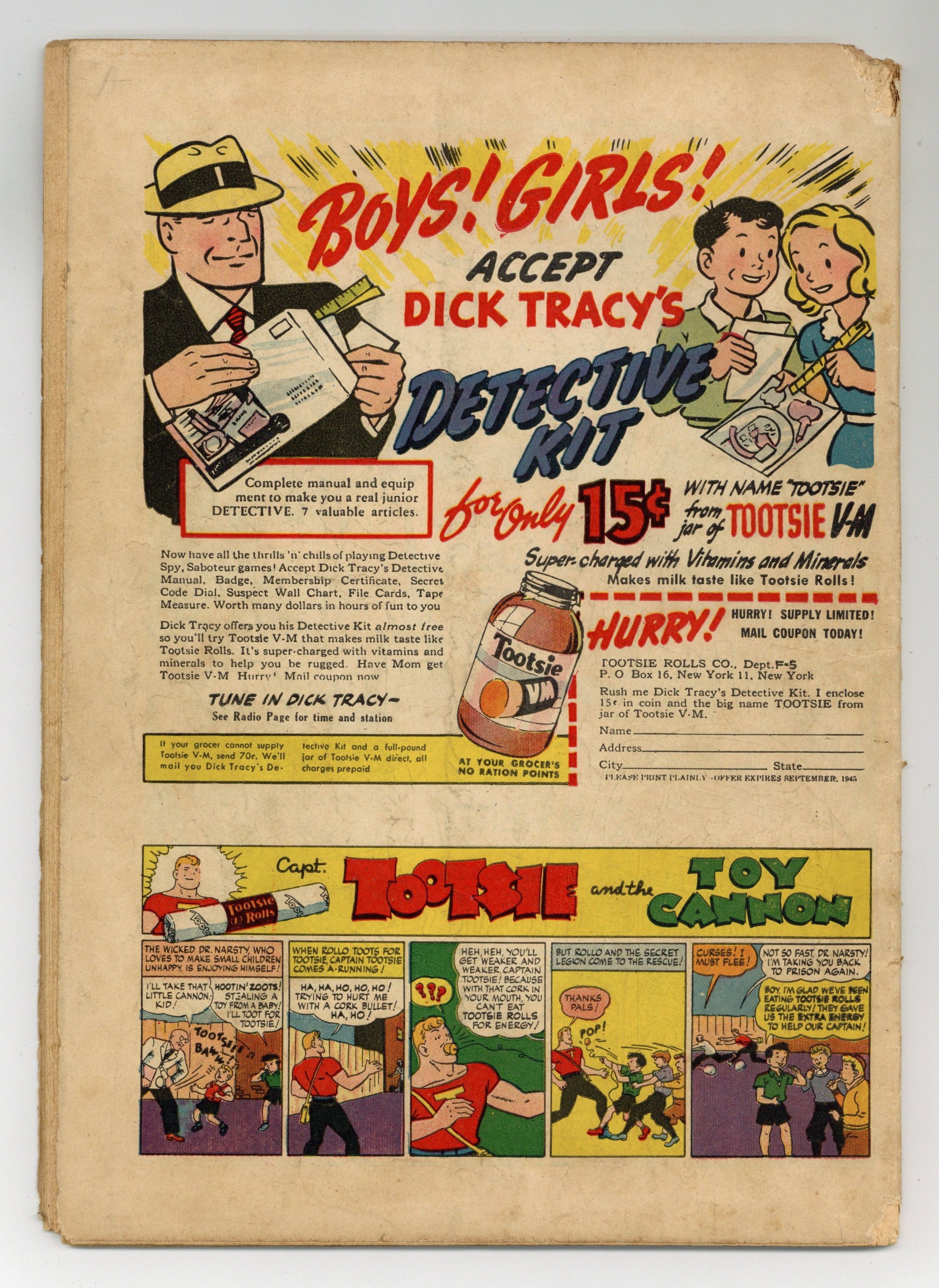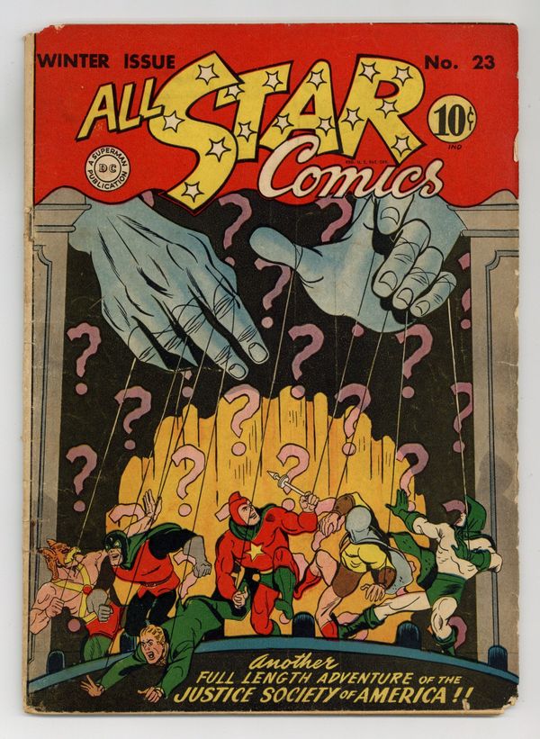 Winter 1945. The Justice Society stars in "The Plunder of the Psycho-Pirate." Plot by Gardner Fox and Shaldon Mayer, script by Fox. Art by Joe Gallagher plus individual chapters featuring Hawkman (art by Sheldon Moldoff), Starman (art by Stan Aschmeier), Dr. Mid-nite (art by Aschmeier), Johnny Thunder (art by Aschmeier), the Spectre (art by Gallagher), and the Atom (art by Gallagher). No Wonder Woman. Two-page text story, "Peruvian Problem." Gallagher cover. 52 Pages, Full Color. Cover price $0.10.