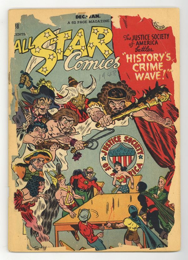 The Justice Society of America battles "History's Crime Wave!" Appearances by Genghis Khan, Attila, Nero, Goliath, Cesare Borgia, and Capt. Kidd. JSA roll call Hawkman, the Flash, Green Lantern, the Atom, Dr. Mid-nite, Johnny Thunder, and Wonder Woman. Black Canary guest stars and begins her regular appearance in the title. Script by Gardner Fox. Art by Alex Toth, Carmine Infantino (with Frank Giacoia inks), and Bob Oksner. Two-page text story, "The Chief Returns a Gift" by Charles King. One-page Tootsie Roll ad, "Captain Tootsie and the Radar Rescue" by C.C. Beck and Pete Costanza. Toth cover. 52 Pages, Full Color. Cover price $0.10.