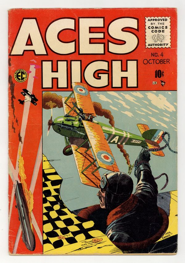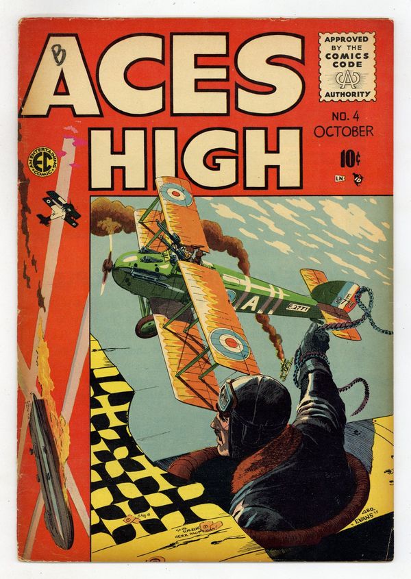 Cover art by George Evans. The Green Kids, art by George Evans; Major Caswell continues to lose green pilots and believes that his commander doesn't care at all about their deaths. The Good Luck Piece, script by Carl Wessler, art by Bernie Krigstein; Buddy doesn't believe in good luck charms, but has one anyway. The Novice and the Ace, script by Carl Wessler, art by Wally Wood; A group of American aces is scared to take on a German pilot with 30+ kills. Home Again, script by Carl Wessler, art by Jack Davis. The Last Laugh text story. 36 pgs. $0.10. Cover price $0.10.