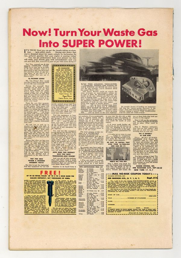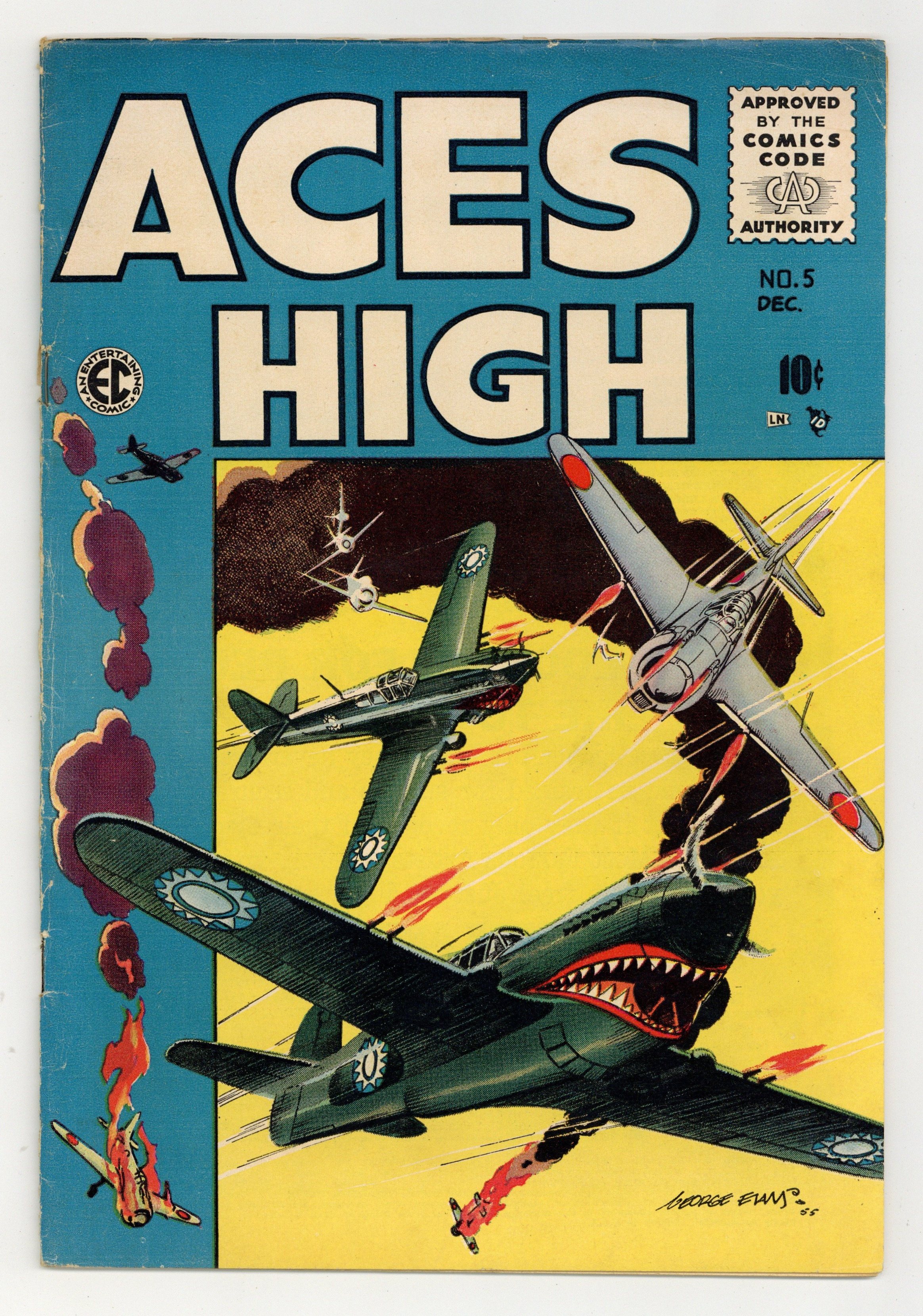 Cover art by George Evans. C'est La Guerre, art by George Evans; An American flight group roll dice to decide who will go on a suicide mission, and the French Captain cannot understand the Americans. Airman Unknown text story. Iron Man, art by Jack Davis; Fred Allison believes he can't be shot down. Spads Were Trump, script by Carl Wessler, art by Bernie Krigstein; Lt. Muller is the best ace in the group, but he seems to be afraid of the German ace named the Red Eagle. Ordeal, art by Wally Wood; Lieutenant Stoner, an experienced pilot, must do the one thing that scares him. 36 pgs. $0.10. Cover price $0.10.