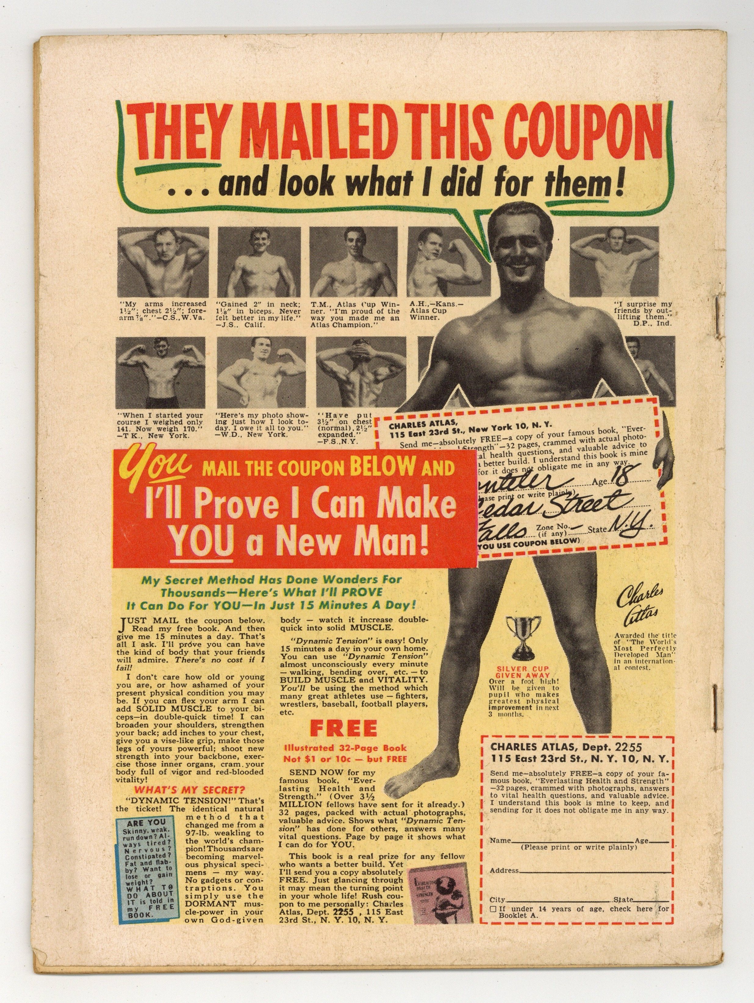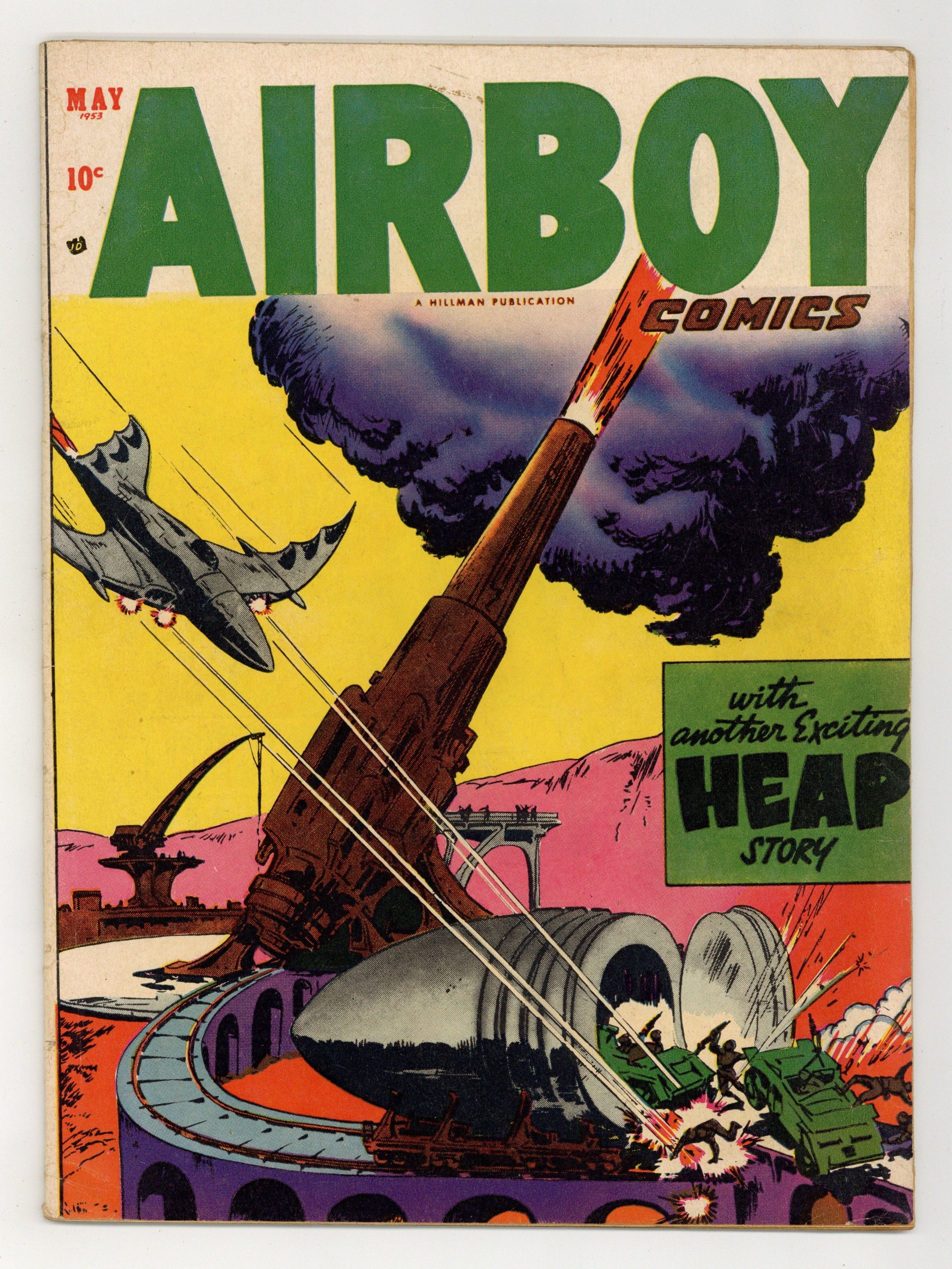 Cover by Ernest Schroeder. Stories and art by Lorence Bjorklund, Gerald McCann and Ernest Schroeder. One of the more fanciful and influential of 1940s aviator heroes, Airboy fights evil with his radio-controlled plane "Birdie" and its plethora of experimental flying tech. Sometimes listed as Airboy Comics #111. No issue # on cover; Vol. 10, issue #4 in indicia. Airboy suspects that enemy agents who use giant guns and bullets to travel are somehow linked to Zomboli, a secretly evil clown who performs for the wealthy elite. An impoverished woman faces an evil countess in a horse race, and The Heap shows up to even the odds. Frogmen discover the link between lobster traps and an attack on a US warship. The final appearances of Airboy and The Heap, until the characters were acquired by Eclipse Publishing in the 1980s. Airboy; The Heap; Lobster Alley; Vitamin Vic; The Tombstone Click; Maloo and the Kicker; Chains of Khydoo. Final issue of the series. 32 pages, Full Color. Cover price $0.10.