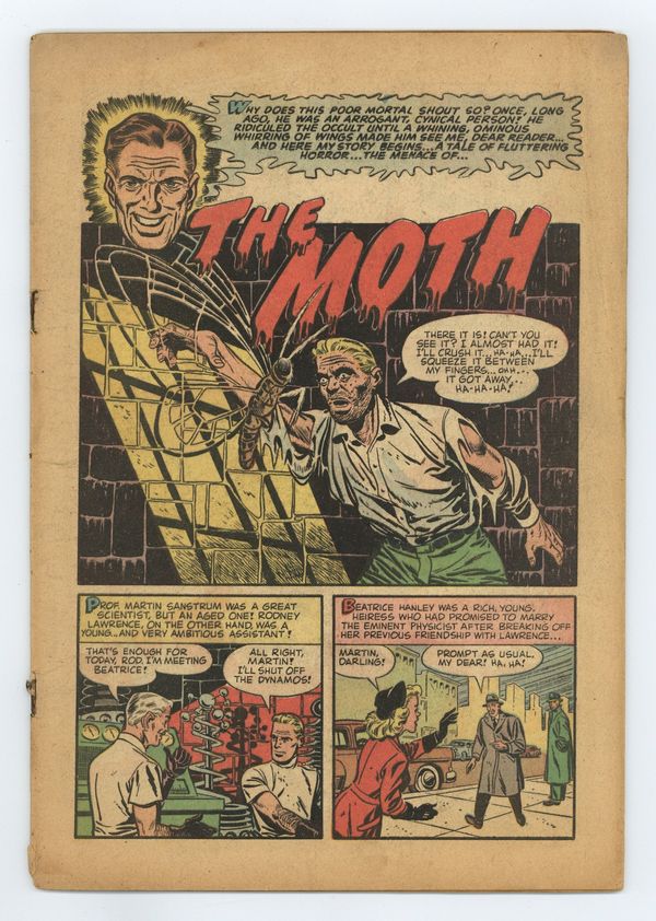 Cover by Warren Kremer. Stories and art by Warren Kremer, Don Perlin, Abe Simon, Joe Certa and Rudy Palais. Former superhero comic Black Cat becomes a showcase for Harvey's unique brand of pre-Code horror. A jealous scientist murders his rival and is soon haunted by horrible moth-creatures. Beautiful Carmela dreams that her murdered lover Tony returns to seek his killer. The new owners of a ranch discover it is haunted by ghostly horsemen. Terrific zombie/ghost cover by Warren Kremer. The Moth; Kill No More; Doom Ranch; The Clock Struck Doom; The Bowels of Death!; Terror of Time!; Unknown Worlds; Lost!; Room of the Past! 36 pages, full color. Cover price $0.10.