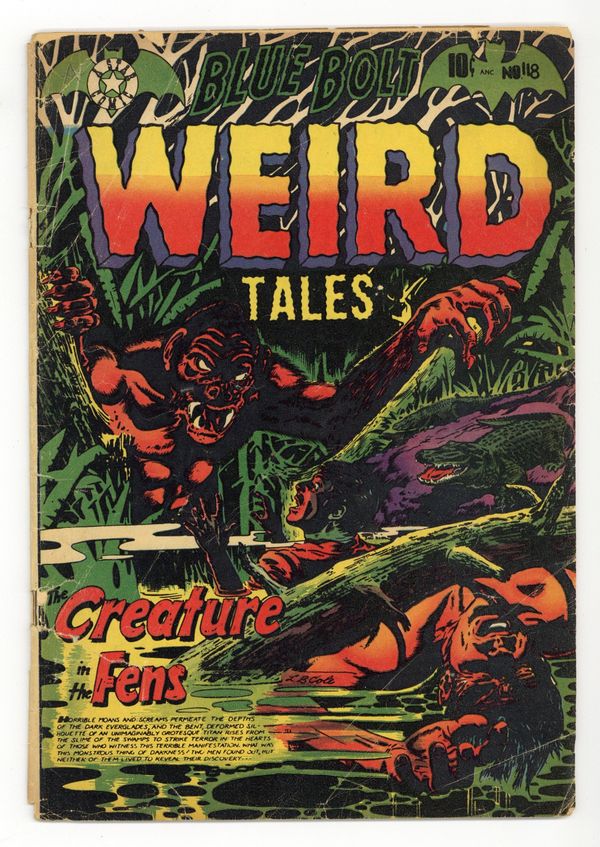 Cover by L. B. Cole. Stories and art by Jay Disbrow, Norman Nodel and Wally Wood. Pre-Code tales of horror and monsters, unofficially called Blue Bolt Weird Tales of Terror. Official indicia title for issues #117- 119 was Blue Bolt Weird Tales. An alien invader in the Florida Everglades discovers he's not the first visitor to the planet. An evil swami sentenced to death swears revenge on his jurors from beyond the grave. Tarzan-like Jungle Jo encounters zombies (actually drugged natives painted with phosphorus) and trained mandrills working under the influence of a mad scientist, with art by comics legend Wally Wood. The Creature in the Fens; Box of Death; Horror of the Future; Weird Nightmare; Jungle Jo: The White Spirit. 32 pages, Full Color. Cover price $0.10.
