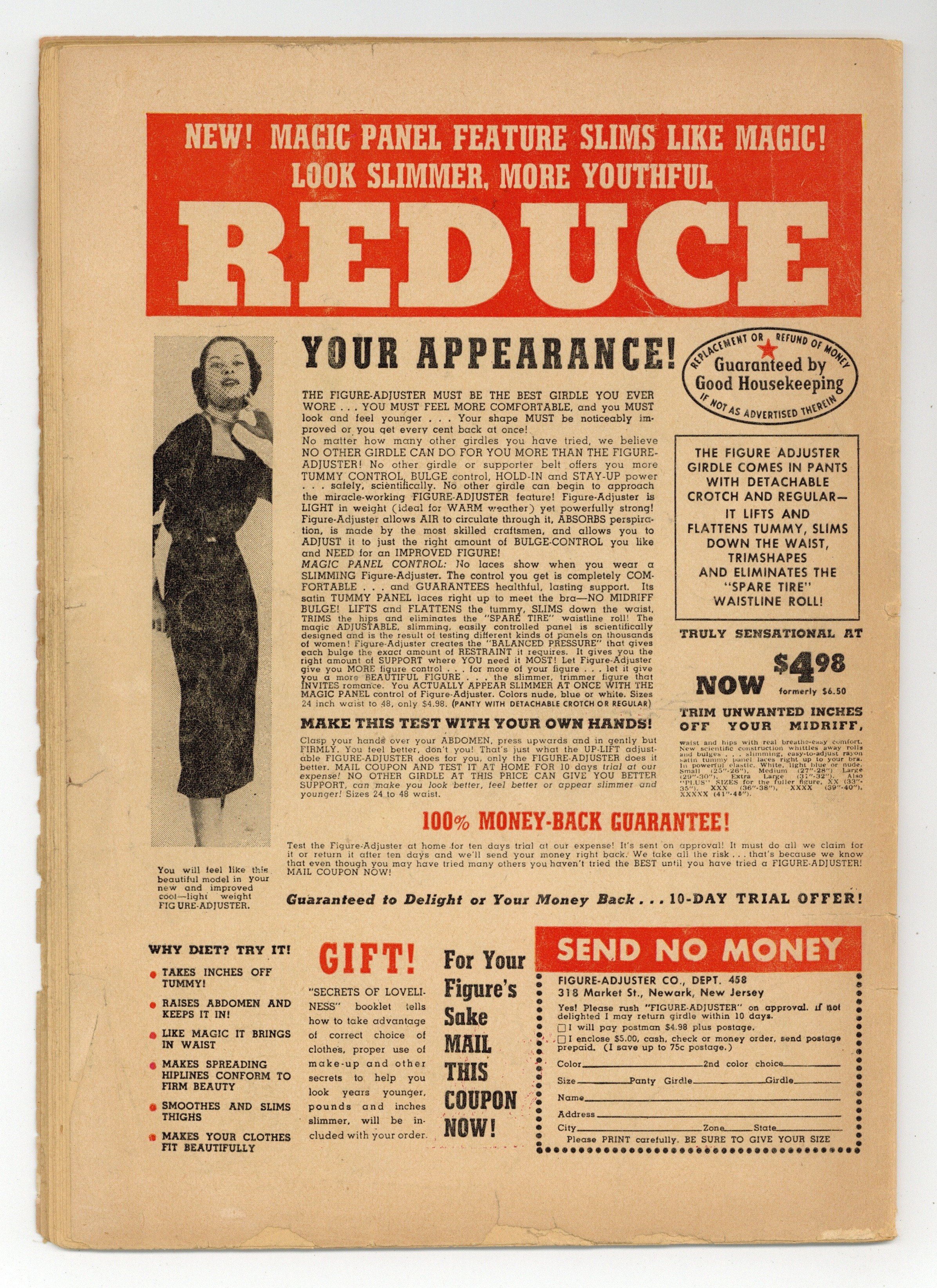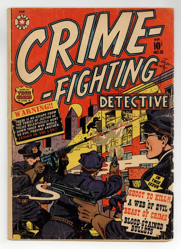 L.B. Cole cover. Contains original and reprinted material as noted. In order of appearance: "A Web of Evil" art by George Peltz; "Shoot to Kill" retitled and reprinted from "Mabel Janek, The Hide-Out Queen!" in Crimes by Women (1948) #9; and "Bloodstained Bullets" retitled and reprinted from "Bennie Dickson and Stella Mae Irwin, Marriage in Crime!!". "Pattern for Murder" illustrated text story and "Beast of Crime" text story. Indicia states "CRIME FIGHTING DETECTIVE". 36 pages. Full color. Cover price $0.10.