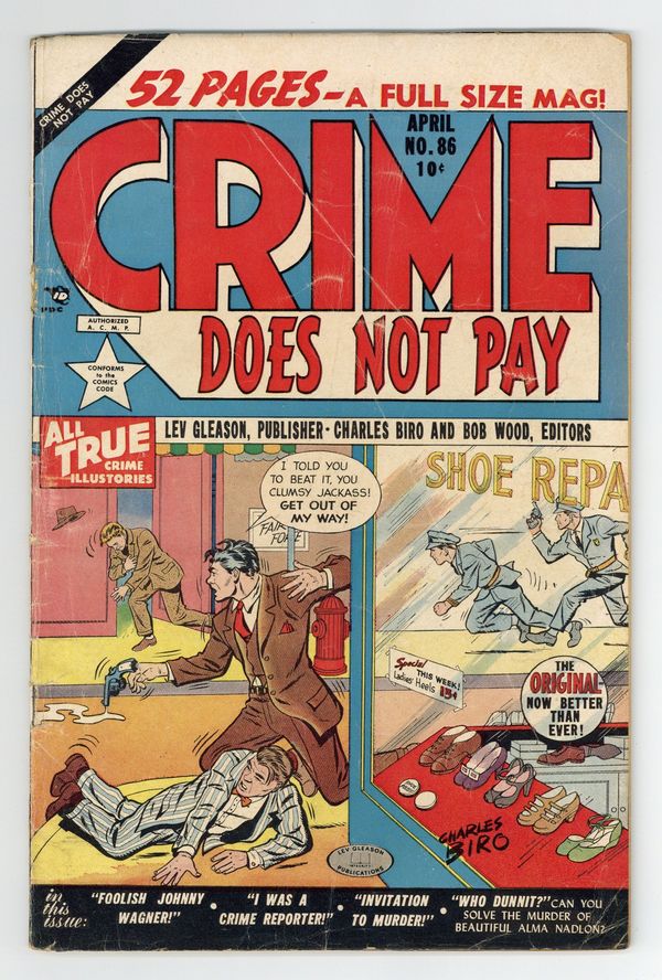 Cover by Charles Biro. Stories and art by George Tuska, Fred Guardineer, Claude Moore, Joseph Gaguardi and Charles Biro. The title that launched the crime comics genre, Crime Does Not Pay was noted for its violent pre-Code content and lurid tales of underworld life. Mr. Crime narrates the tale of Johnny, who sees a golden opportunity when a hood drops a gun into his lap. Crime reporter Dave Stratton follows a lead from an art show into a two-fisted, gun-blazing adventure. A story that dares the reader to figure out who murdered a woman for a fortune in jewels. Foolish Johnny Wagner; I Was a Crime Reporter!; This'll Kill Ya; Thug-Uglies; On the Level; Our Police Hall of Fame; Invitation to Murderer!; Who Dunnit? 48 pages, Full Color. Cover price $0.10.