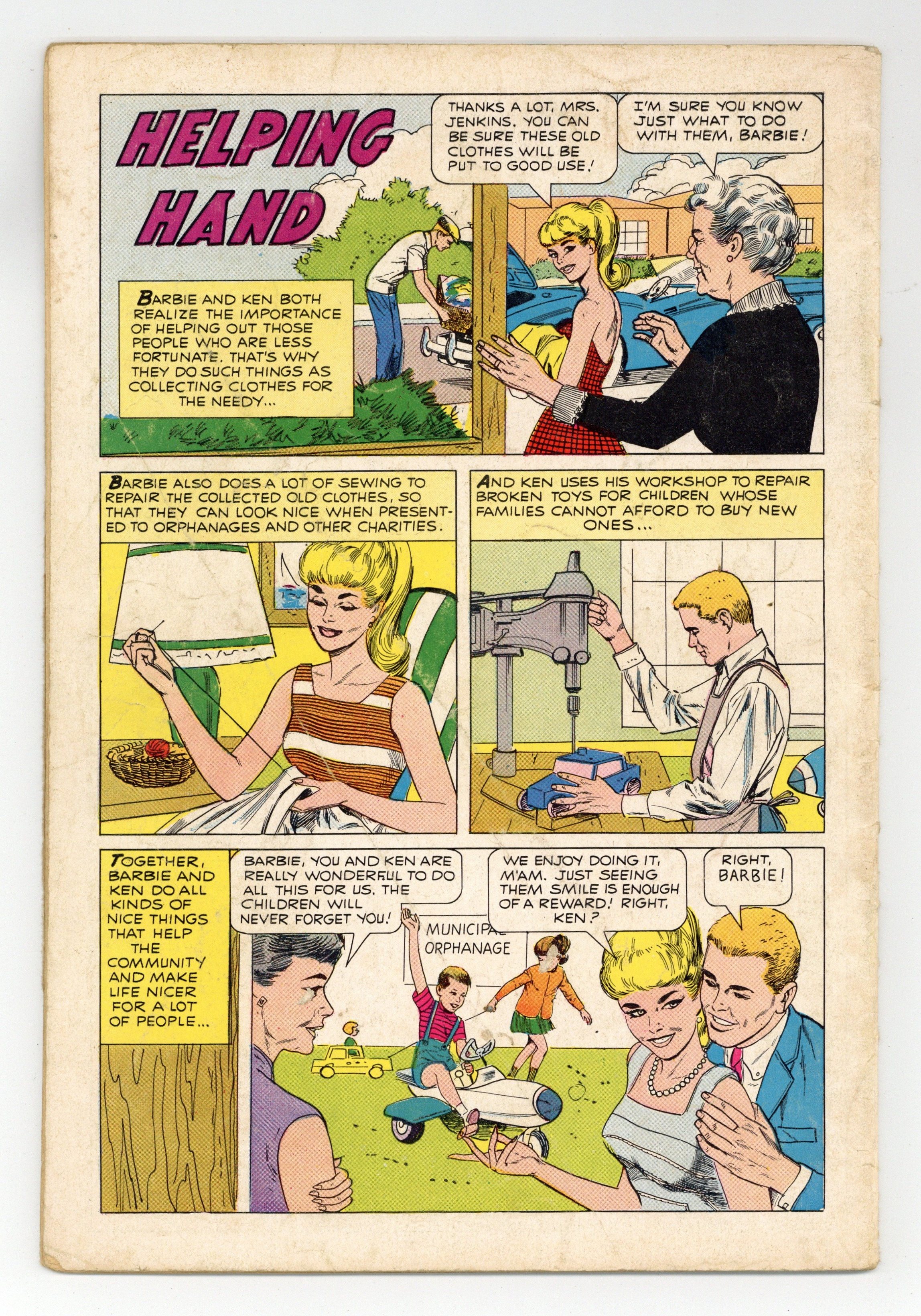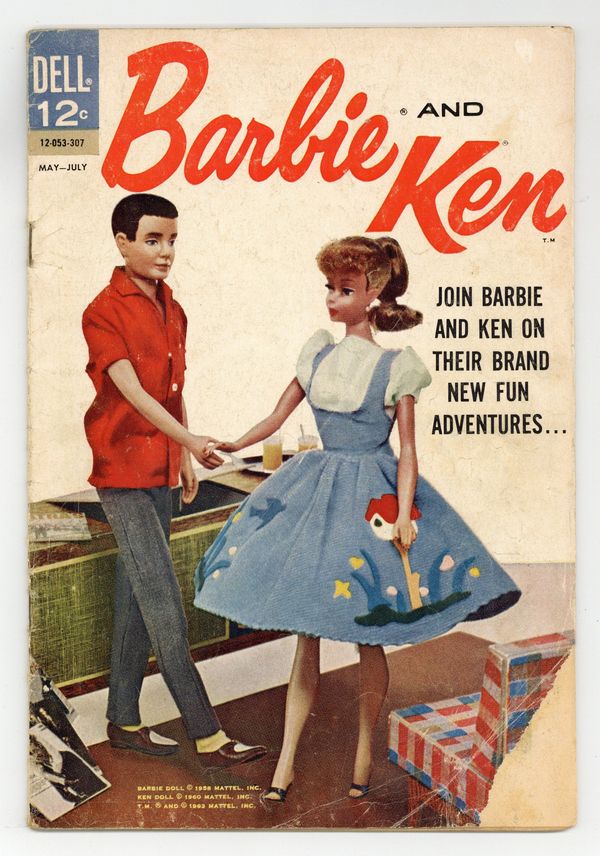 Art by Vince Colletta and John Tartaglione. Cover number is #12-053-307. Dell creates the first comic book based on the popular Barbie and Ken dolls. Members of the Barbie Fan Club discuss their imaginary adventures with Barbie and Ken. Jody sees baton-twirling Barbie leading the town parade before the big game. Switchboard operator Barbie shows Cindy how 1960s-era telephone-exchange technology works, including pre-911 emergency calls. Mitzi visits the circus with her Uncle Ben, and Barbie is the star of the show. Plus one-pagers about Ken and Barbie, including their charity work. Miss Wonderful; Barbie's Baton; Emergency; Sun and Fun; Helping Hand. 32 pages, Full Color. Cover price $0.12.