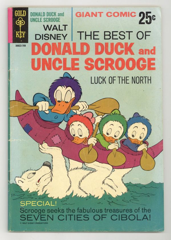 $15.50THE BEST OF DONALD DUCK AND UNCLE SCROOGE (GOLD KEY) #2 No Date 25c Number on cover: 30022-709. Giant size comic reprinting two classic Duck stories by Carl Barks: "Luck of the North" in which Donald, Huey, Dewey, and Louie journey to the Artic Ocean to rescue Gladstone Gander who was sent there as a joke by Donald and "The Seven Cities of Cibola" in which Scrooge, Donald, and the nephews go arrowhead hunting in the desert which leads to a hunt for the legendary Seven Cities of Cibola. Issue also has a four-page story in which Scrooge runs for treasurer and one-page gag strips. Back cover has a pinup of Scrooge. Cover price $0.25.
