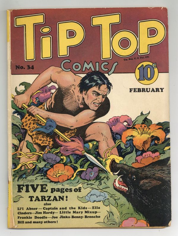 Cover by Paul Berdanier. Stories and art by Hal Foster, Al Capp, Ernie Bushmiller, Bill Conselman, Charlie Plumb, Rudolph Dirks, Gus Mager, Dick Moores, Paul Berdanier, Harry O'Neill, Fred Methot, Alan Maver, Ed Dodd, J. Carver Pusey, R. M. Brinkerhoff, Robert Dickey, and Ben Batsford. Sometimes listed as Tip Top Comics Vol. 3 #10. Tip Top Comics presented color reprints of United Features newspaper comic strips. Tarzan is pursued by Gorrey and the forces of the lost city, in Tarzan Sunday strips with art by Hal Foster. But they aren't expecting him to make an ally of Lethor, the lion who was commanded to kill him. Jim Hardy pursues the kidnappers of Miss Plant. Plus a Li'l Abner storyline by Al Capp. Li'l Abner; The Captain and the Kids; Tarzan of the Apes; Jim Hardy; Fury of '49; Bumps; Divot Diggers; Broncho Bill; Stamp Tips; Opportunity Knox; Benny; Home Towners; Frankie Doodle; Bucky and His Pals; Buster Beans; Hawkshaw the Detective; How It Began; Tip Top Cartoon Club; Phil Fumble; Fritzi Ritz; Twice Told Tales; Joe Jinks Featuring Dynamite Dunn; Little Mary Mixup; Ella Cinders; Chris Crusty. 64 pages, Full Color. Cover price $0.10.