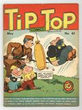 Stories and art by Burne Hogarth, Al Capp, Ernie Bushmiller, Bill Conselman, Charlie Plumb, Rudolph Dirks, Gus Mager, Dick Moores, Al McWilliams, Harry O'Neill, Hal Forrest, Bernard Dibble, Raeburn van Buren, R. M. Brinkerhoff, and Ben Batsford. Sometimes listed as Tip Top Comics Vol. 6 #1. Tip Top Comics presented color reprints of United Features newspaper comic strips. Having enlisted the lions in his battle, Tarzan next tries to tame an elephant stampede, in Tarzan Sunday strips with art by Burne Hogarth. The mad sculptor Pignalli has distributed thousands of patriotic statues through the city, but they are cleverly designed bombs, and only Mirror Man can find them all. The Triple Terror superhero team finds the secret formula for "liquid light" tattooed on a monkey's tail. Plus a Li'l Abner storyline by Al Capp. Li'l Abner; The Captain and the Kids; Tarzan of the Apes; The Mirror Man; The Triple Terror; Jim Hardy; Bumps; Broncho Bill; Back Home Again; Stamp Tips; Looy Dot Dope; Frankie Doodle; Tailspin Tommy; Iron Vic; Phil Fumble; Fritzi Ritz; Little Mary Mixup; Abbie an' Slats; Ella Cinders. 64 pages, Full Color. Cover price $0.10.