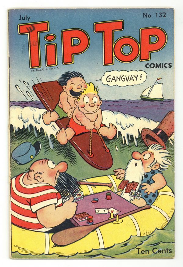 Stories and art by Al Capp, Ernie Bushmiller, Rudolph Dirks, Sam Leff, Bernard Dibble, Ernest Hix, Raeburn Van Buren and Gustavo Arriola. Sometimes listed as Tip Top Comics Vol. 11 #12. Tip Top Comics presented color reprints of United Features newspaper comic strips. Bathless Groggins boxes Banker Hagstone to settle a grudge match worth $10,000 in stock shares, in an Abbie an' Slats strip with nice art by Raeburn van Buren. After Boris Borscht knocks Curly down in an impromptu fight in the gym, Boris is offered $25,000 to fight Curly in the ring. T. Heathcliff McMarvel uses his reverso-mento-magneto machine to switch bodies with Li'l Abner. Li'l Abner; The Captain and the Kids; Stamp Tips; Curly Kayoe; Abbie an' Slats; El Bombo; Back Home Again; Gordo; Nancy; Fritzi Ritz; Strange as It Seems; How It Began. 48 pages, Full Color. Cover price $0.10.