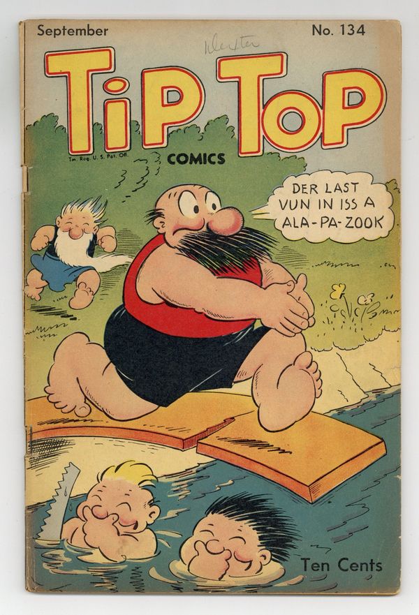 Tags: Comic Strip ReprintsPublished Sep 1947 by United Features Syndicate.$27.00Cover by Rudolph Dirks. Stories and art by Al Capp, Ernie Bushmiller, Rudolph Dirks, Sam Leff, Bernard Dibble, Ernest Hix, Raeburn Van Buren and Gustavo Arriola. Sometimes listed as Tip Top Comics Vol. 12 #2. Tip Top Comics presented color reprints of United Features newspaper comic strips. Bathless Groggins invents a washing machine that destroys clothing, but also brings back the dead, in an Abbie an' Slats strip with fine art by Raeburn van Buren. Fritzi Ritz falls asleep at the beach with a tide coming in one of several strips that showcase Bushmiller's "good girl" art. Mr. Biltybux is so caught up in his story about baseball that he doesn't even notice when a robber steals his and Bombo's pants. Plus a Fearless Fosdick storyline by Al Capp. Li'l Abner; The Captain and the Kids; Stamp Tips; Curly Kayoe; Abbie an' Slats; El Bombo; Gordo; Nancy; Fritzi Ritz; Strange as It Seems; How It Began. 48 pages, Full Color. Cover price $0.10.