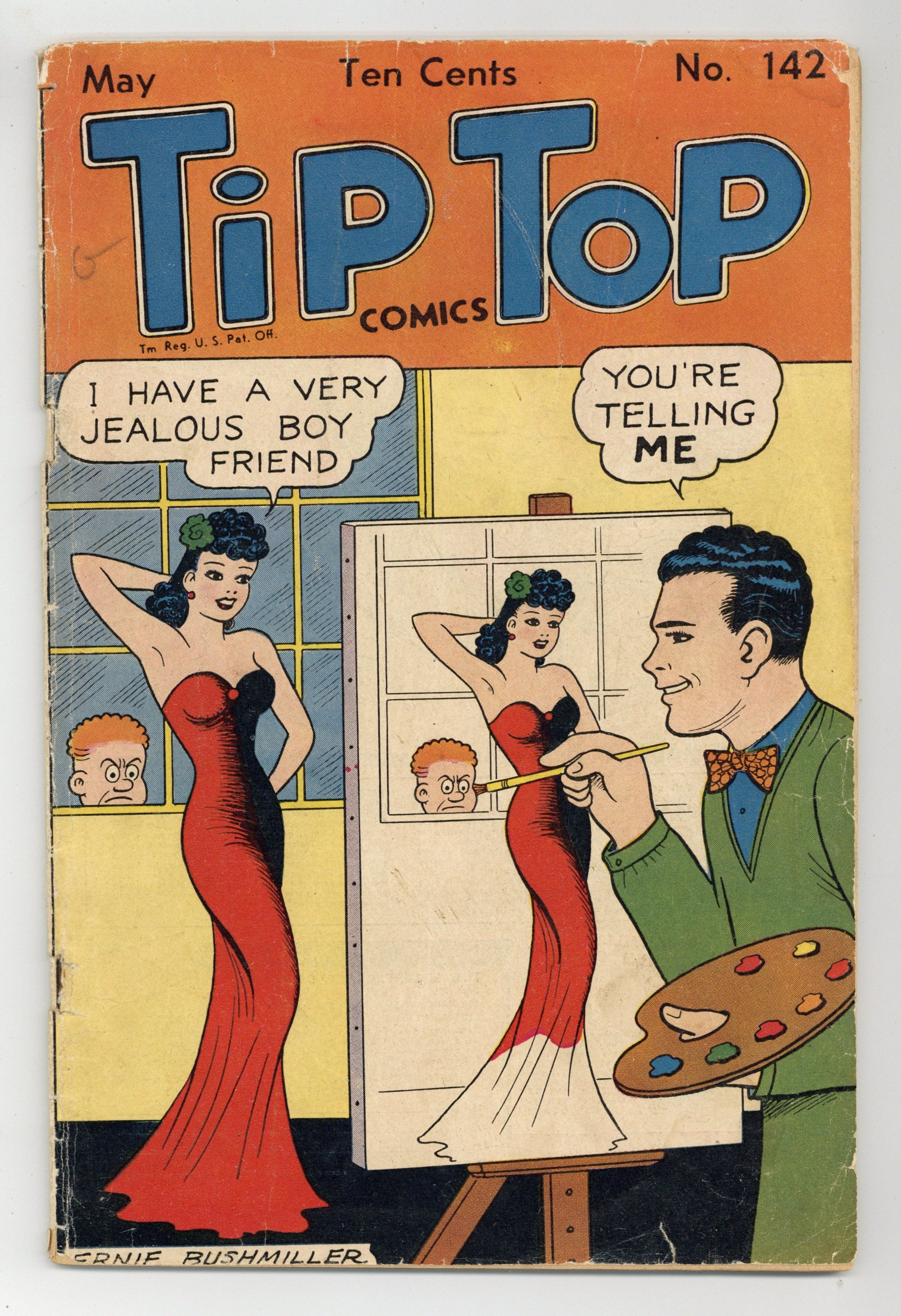Cover by Ernie Bushmiller. Stories and art by Al Capp, Ernie Bushmiller, Rudolph Dirks, Sam Leff, Bernard Dibble, Ernest Hix, Raeburn Van Buren and Gustavo Arriola. Sometimes listed as Tip Top Comics Vol. 12 #10. Tip Top Comics presented color reprints of United Features newspaper comic strips. Bathless Groggins is protected by a Shmoe - a "Li'l Abner" type with a sarong and a prehensile tail - in an Abbie an' Slats strip with art by Raeburn van Buren. Phil Fumble admires advertising billboards, in a strip that showcases Bushmiller's "good girl" art. Bushmiller's "good girl" art is on the cover as well. Mr. Biltybux finds a $100,000 bill and tries to get it changed, but no one wants to handle it. Plus a Li'l Abner storyline by Al Capp. Li'l Abner; The Captain and the Kids; Stamp Tips; Curly Kayoe; Abbie an' Slats; El Bombo; Gordo; Nancy; Fritzi Ritz; Strange as It Seems; How It Began. 48 pages, Full Color. Cover price $0.10.