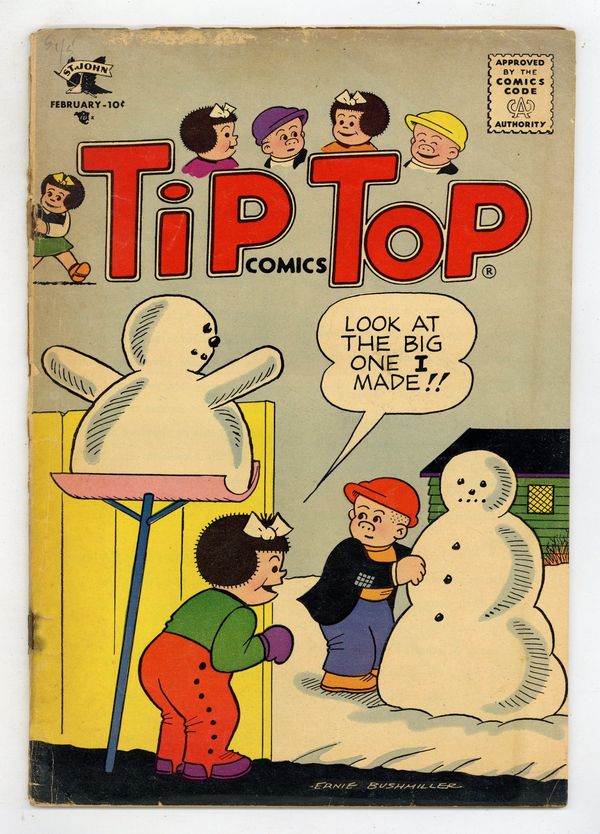 Cover by Ernie Bushmiller. Stories and art by Charles Schulz, Ernie Bushmiller, and Rudolph Dirks. Tip Top Comics presented color reprints of United Features newspaper comic strips. One of the backup strips in the comic is Charles Schulz's Peanuts; several daily strips are presented in full color. Bongo offers to let the Captain become king of the island. Basil, the King of the Cats, decides it's time to take the test for his driver's license. The Family Workshop; Nancy; Peanuts; The Captain and the Kids; Basil the King of Cats: Traffic Problem. 32 pages, Full Color. Cover price $0.10.