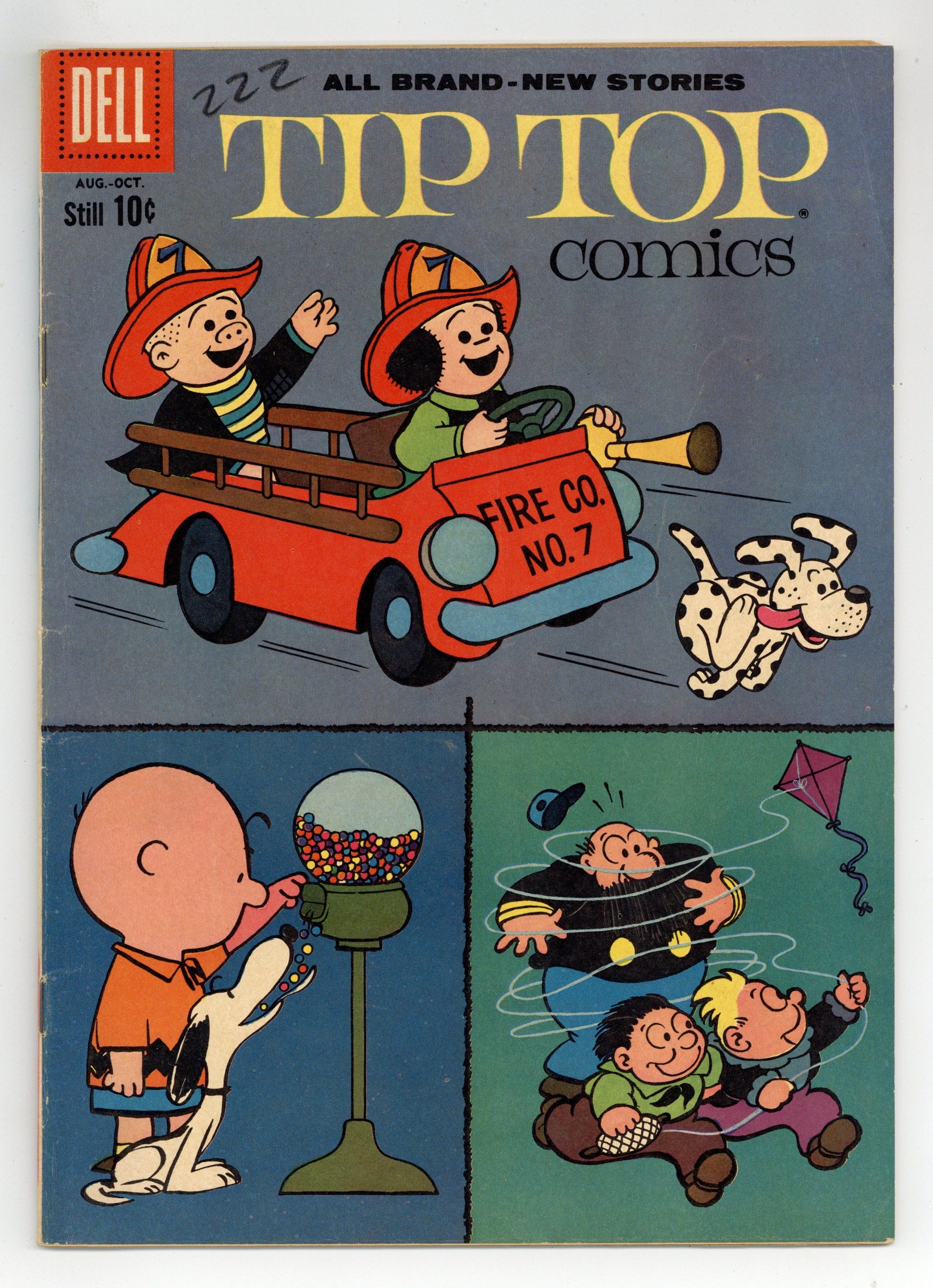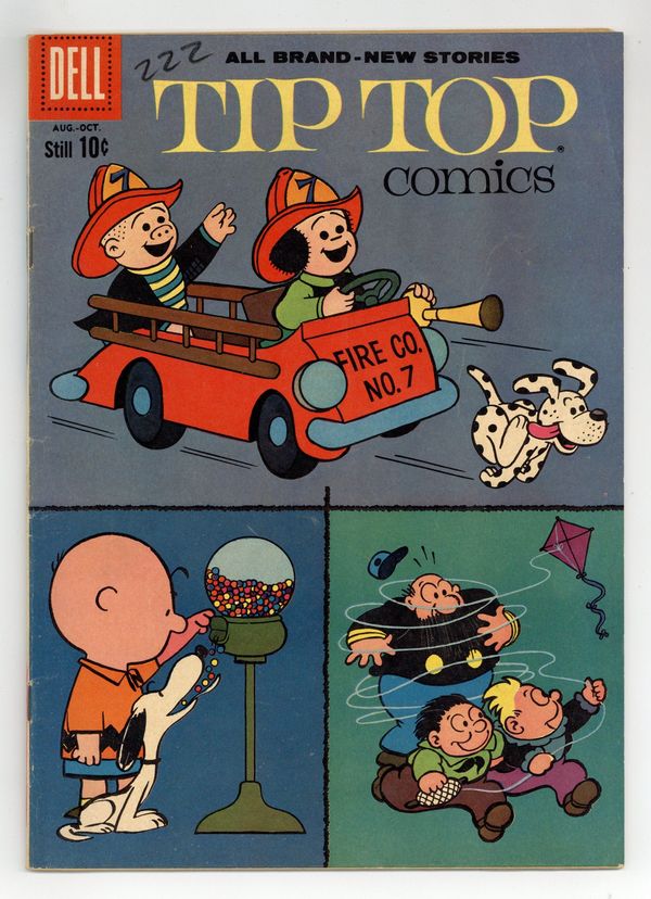 Cover by Dale Hale and Hy Eisman. Stories and art by John Stanley, Dale Hale and Hy Eisman. Tip Top Comics presented stories featuring characters from United Features newspaper strips. One of the strips in the comic is Charles Schulz's Peanuts, featuring rare stories not written or drawn by Schulz, but by fellow artist Dale Hale. While Charlie Brown is repairing his doghouse, Snoopy moves into an abandoned house. When Linus and the others come to the house, it seems like the perfect opportunity for a scare. Plus Nancy and Sluggo stories written by Little Lulu's John Stanley. Nancy and Sluggo: Jealousy; Peanuts: House Haunting; The Treasure Hunt; Sluggo: The Wire Trap; The Captain and the Kids: The Masterpiece; Peanuts: The Slow Draw. 32 pages, Full Color. Cover price $0.10.